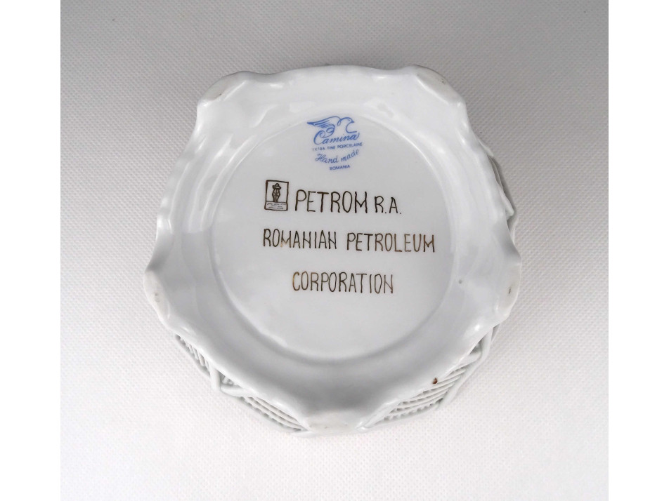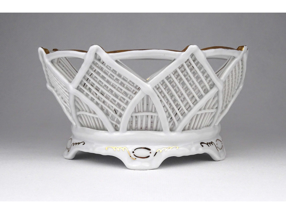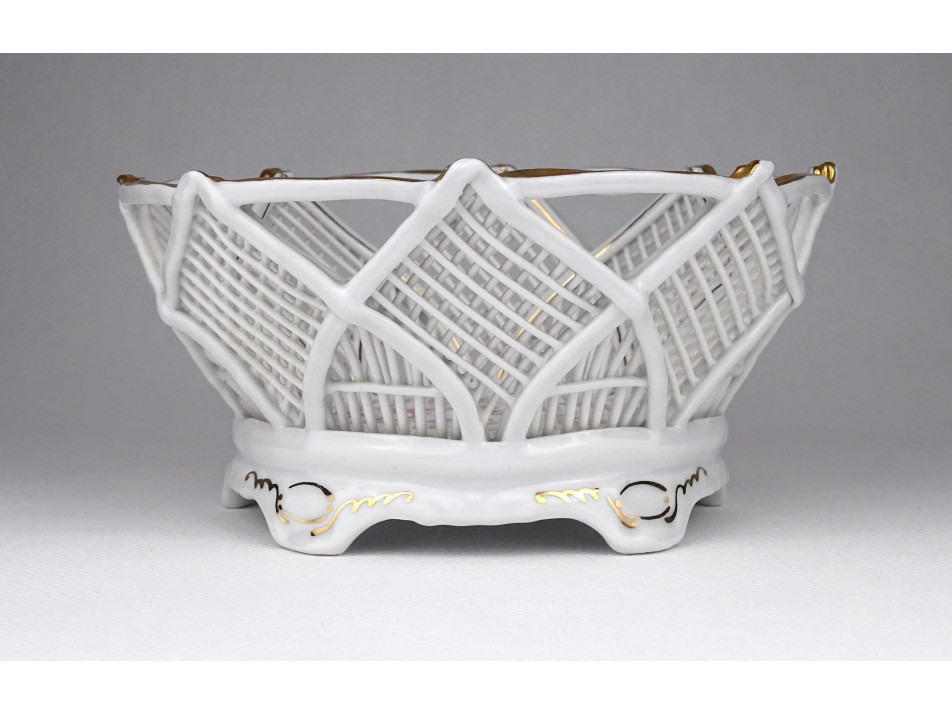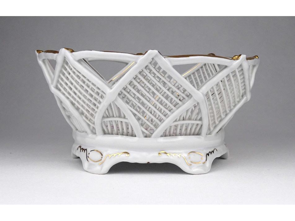Régi, hibátlan állapotú, áttört, fonott szélű, aranyozott, rózsa mintás Camina porcelán kosár.