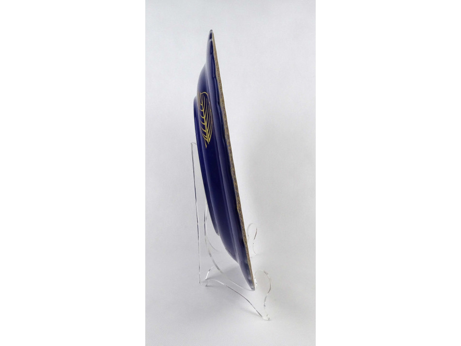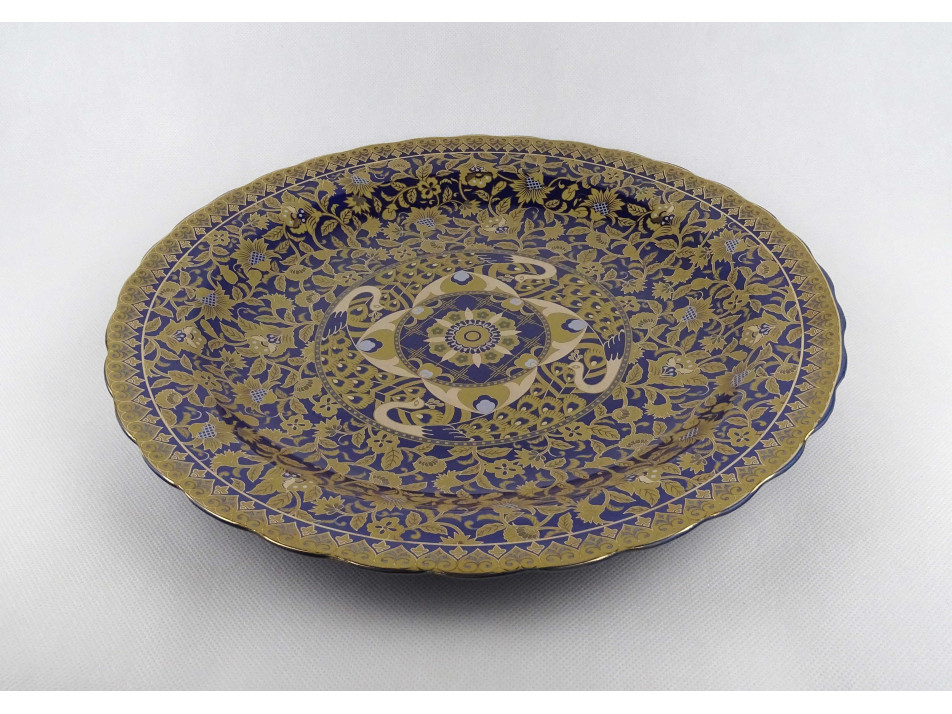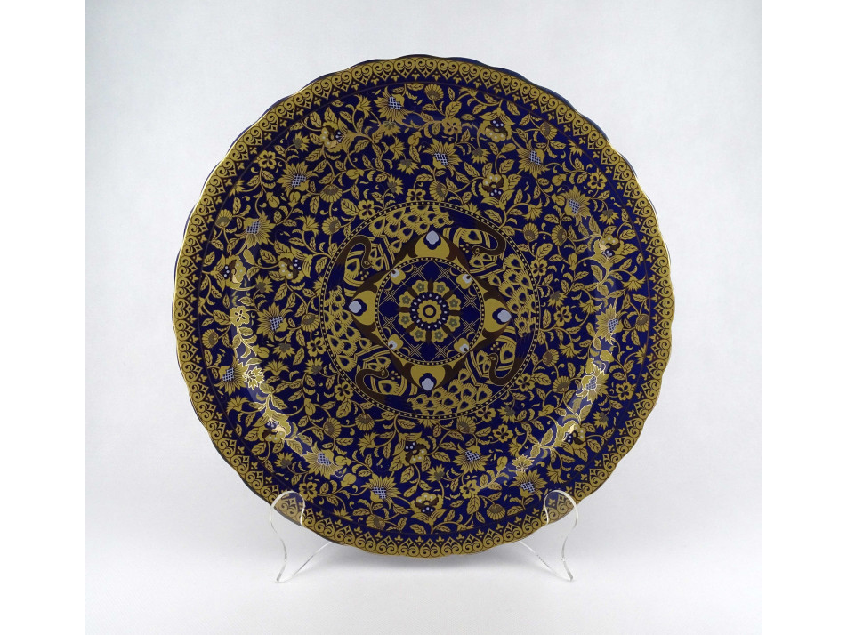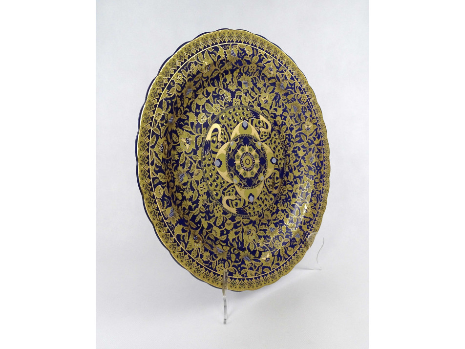 Nagy méretű, hibátlan állapotú, kobaltkék színű, gazdagon aranyozott keleti, perzsa díszítésű pávás porcelán tál, dísztál.