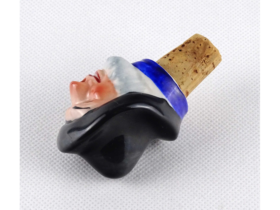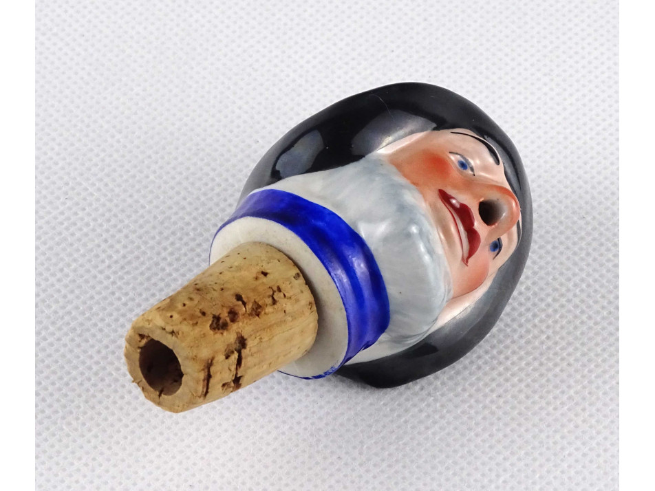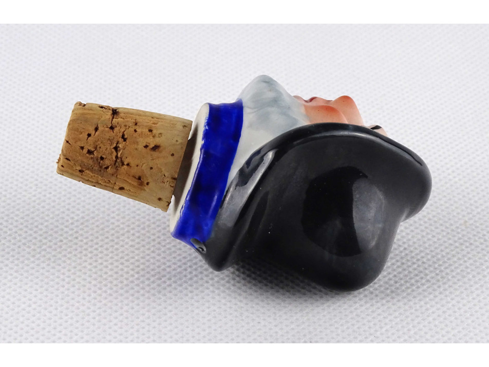 Régi, hibátlan állapotú, jelzetlen, kézi festéssel díszített, szakállas férfi fej formájú, parafa burkolatú porcelán palackdugó.