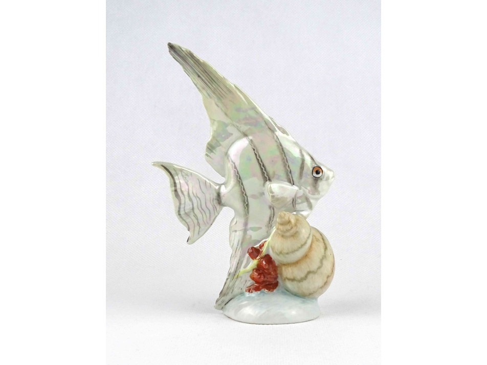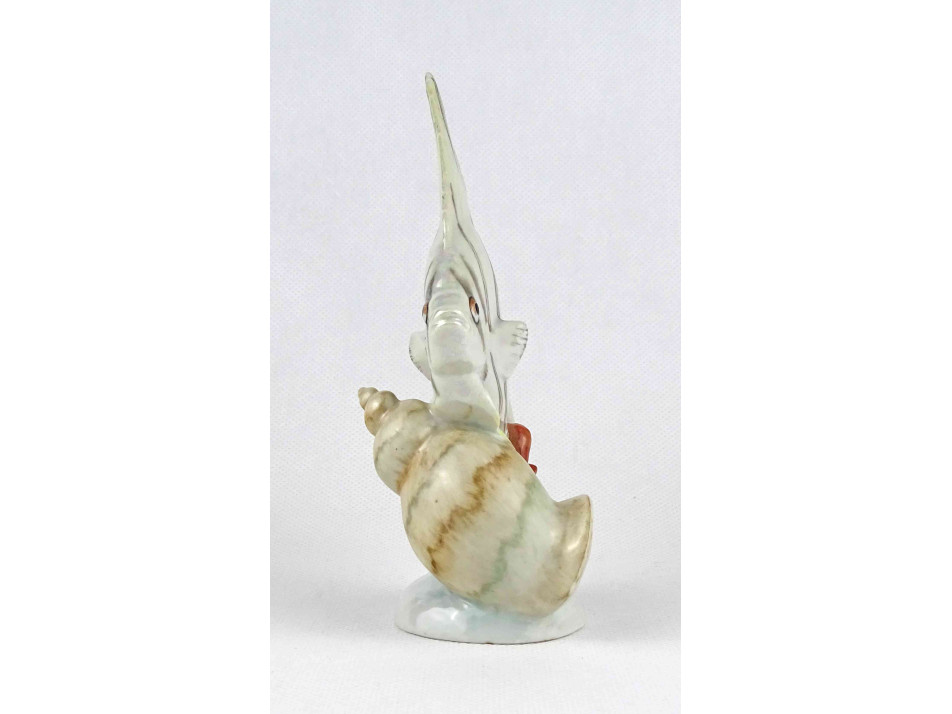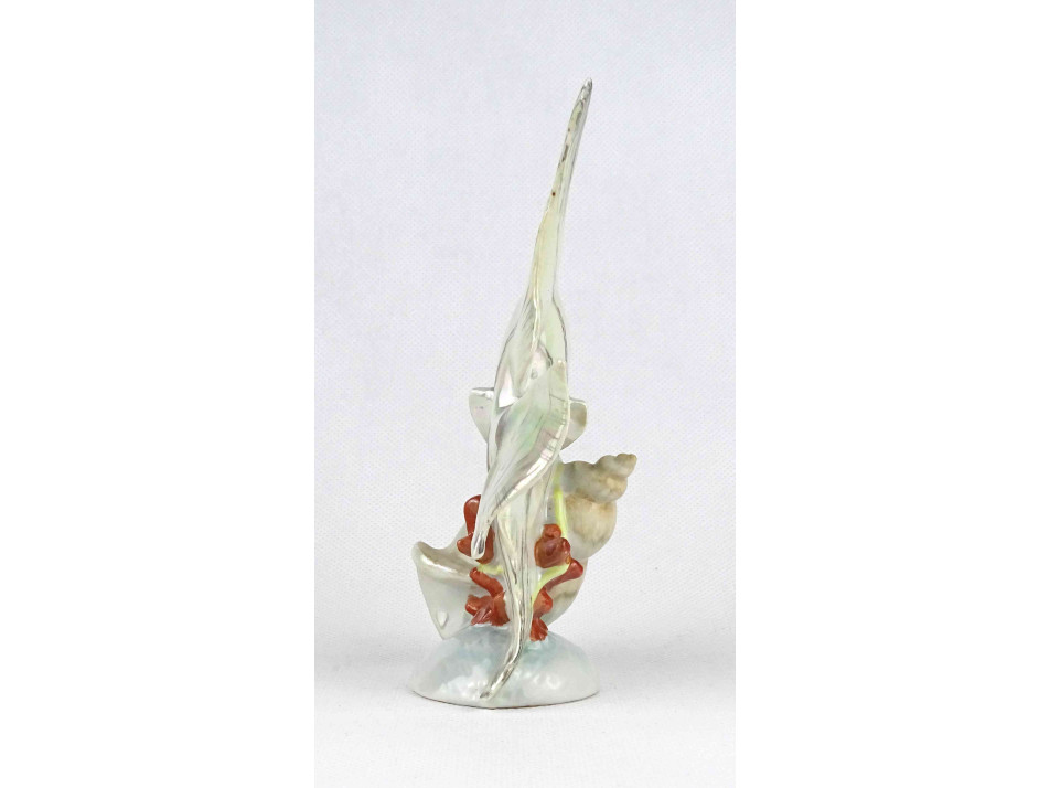 Régi, hibátlan állapotú, irizáló mázas Kőbányai porcelán tengeri hal szobor, vitorlás hal figura, tengeri csigával.