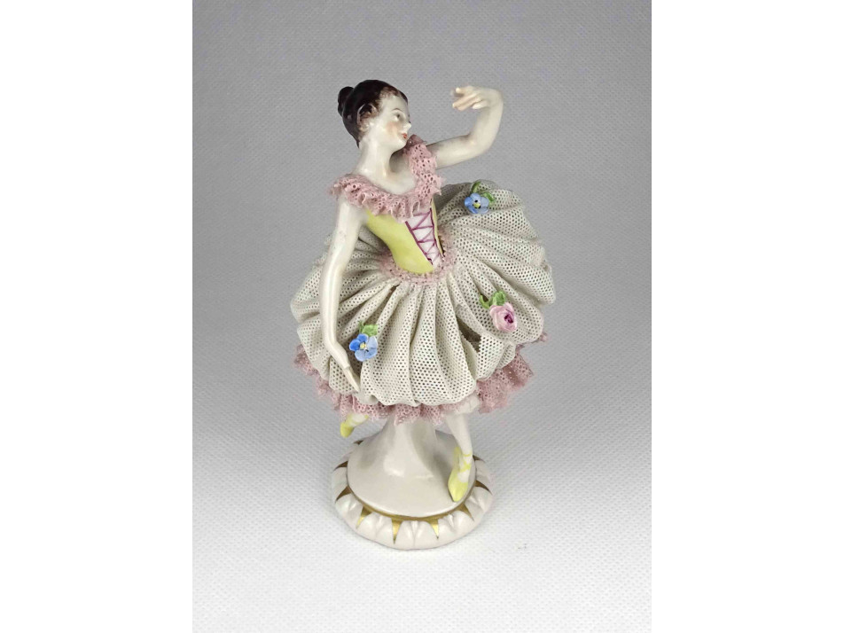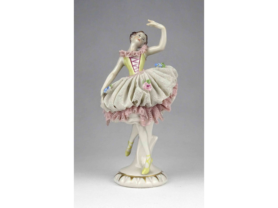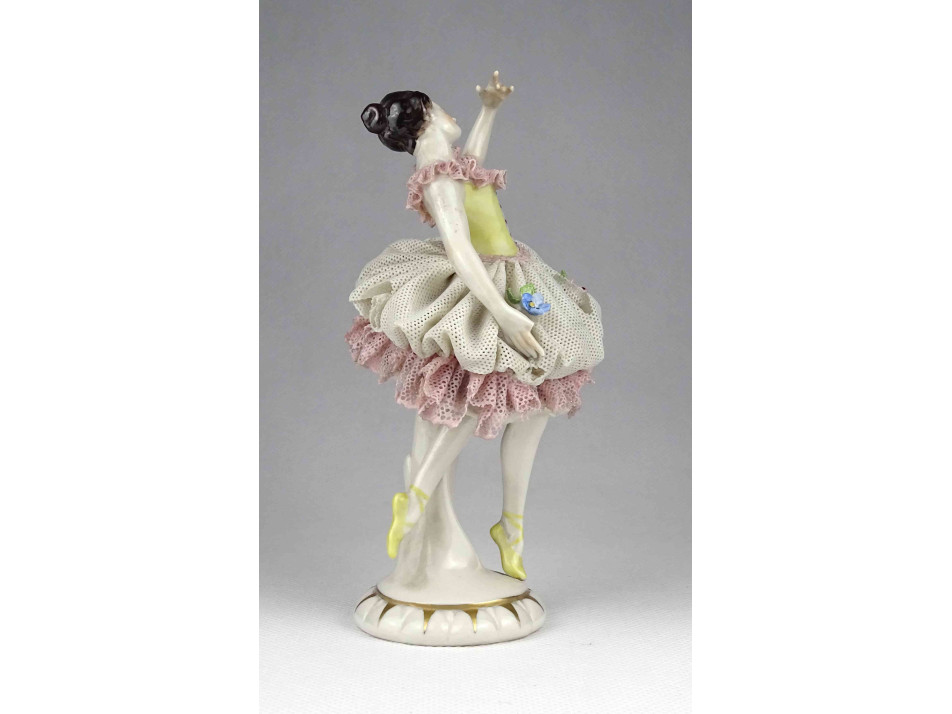 Antik, szép állapotú tüllszoknyás Volstedter porcelán balerina. Szoknyáján több helyen kisebb letörések találhatóak, jobb kezének mutatóujja hiányzik, lásd fotó.