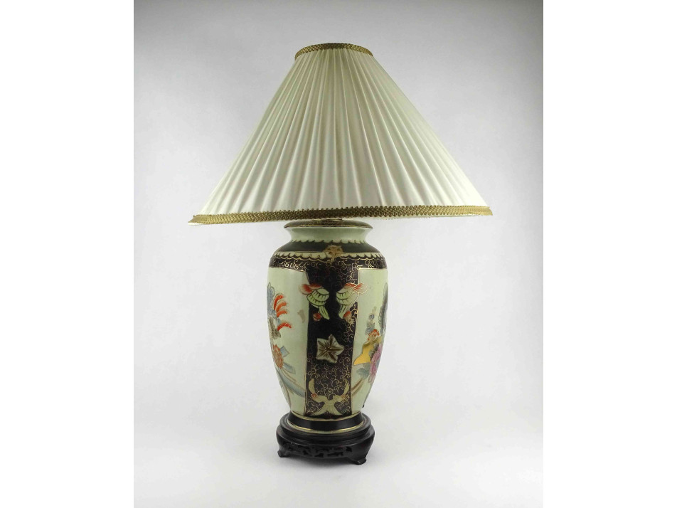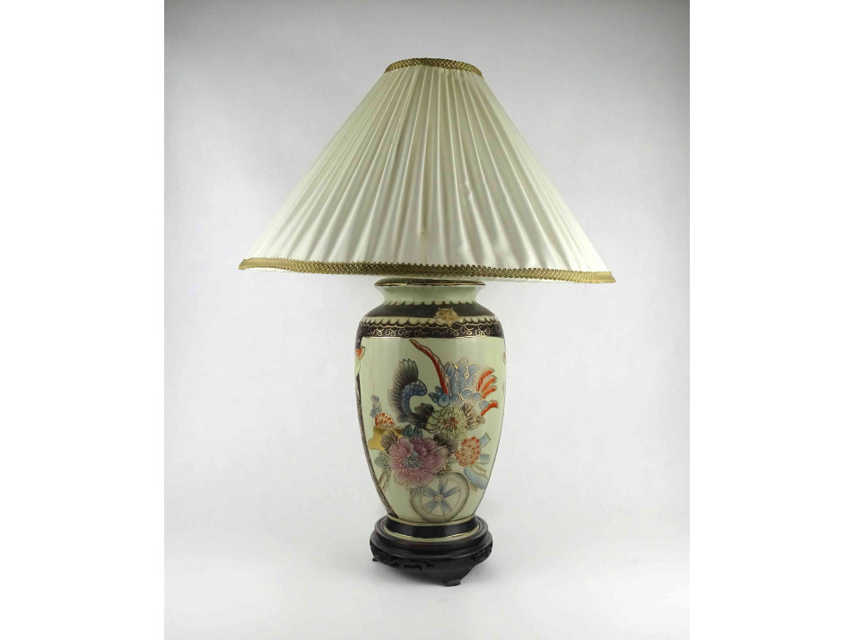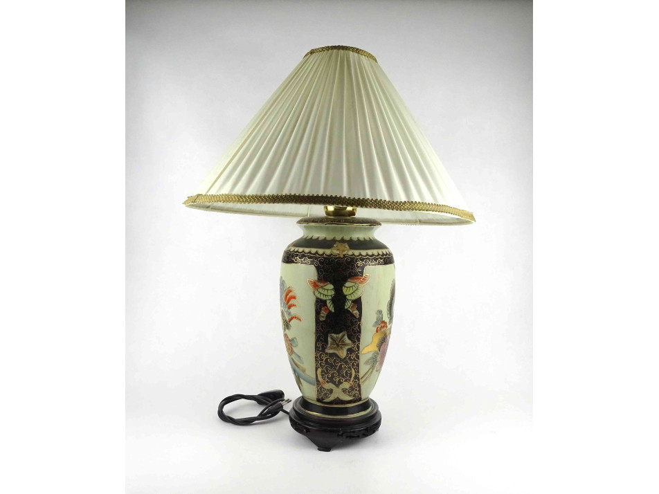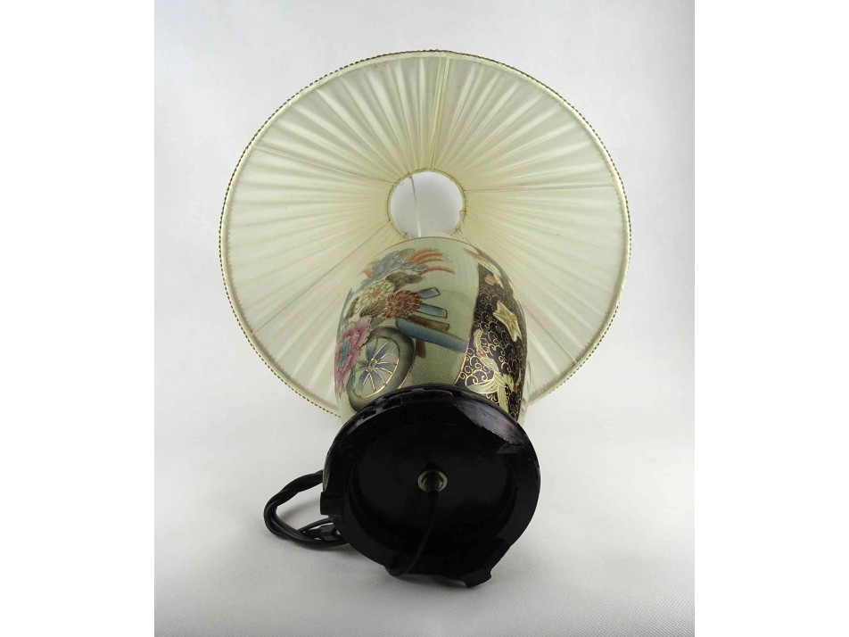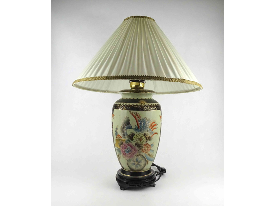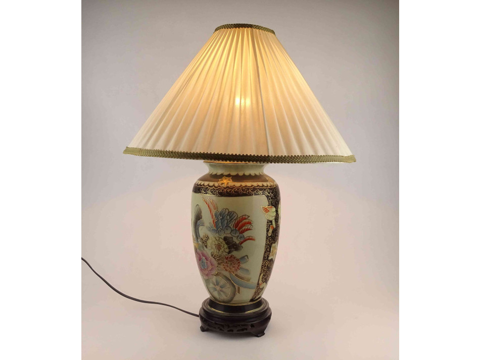 Régi, hibátlan állapotú, nagyméretű, áttört fa talapzaton álló porcelán testű keleti asztali lámpa. A test kézzel festett, kínai virágmotívumokkal díszített, gazdagon aranyozott. Rajta hozzá illő, nagyméretű textil lámpabura. Egy nagyméretű (E27) izzó való bele. Működőképes állapotban.