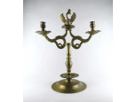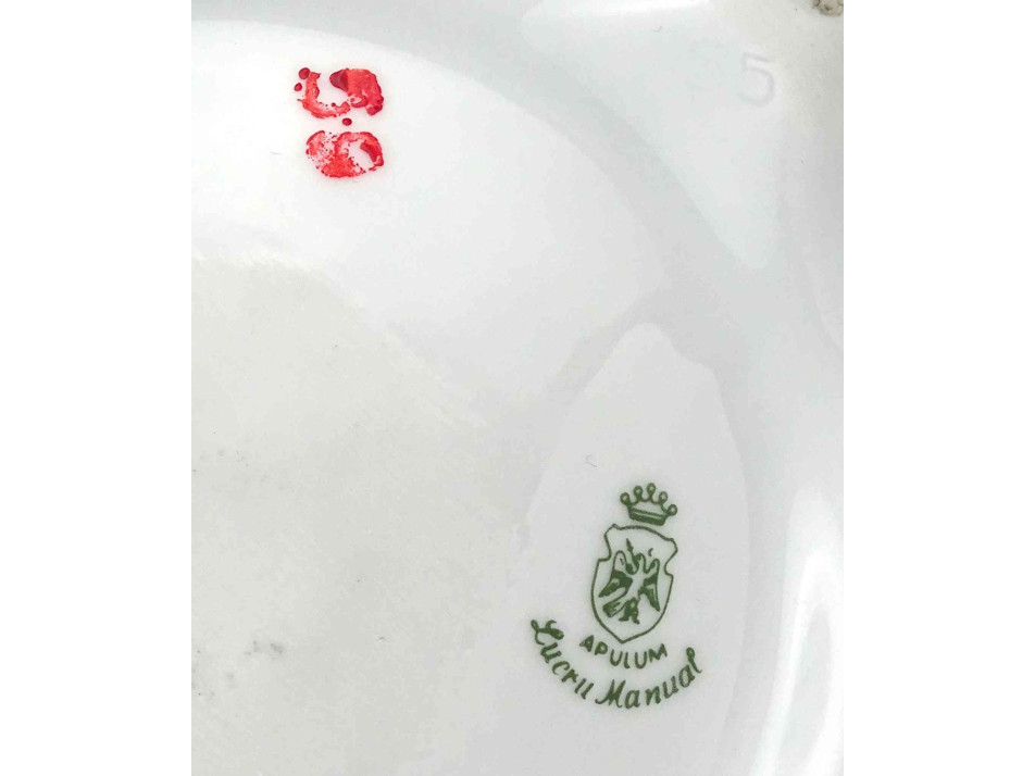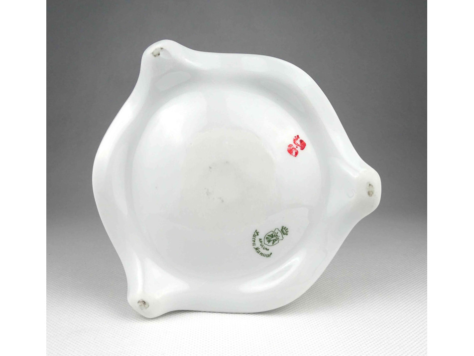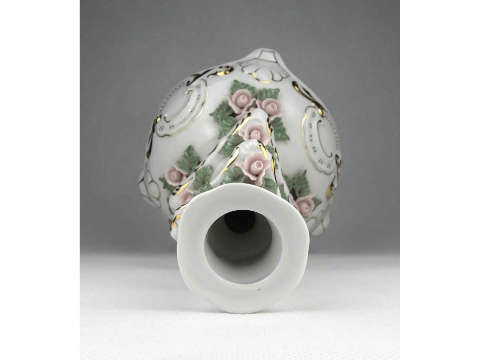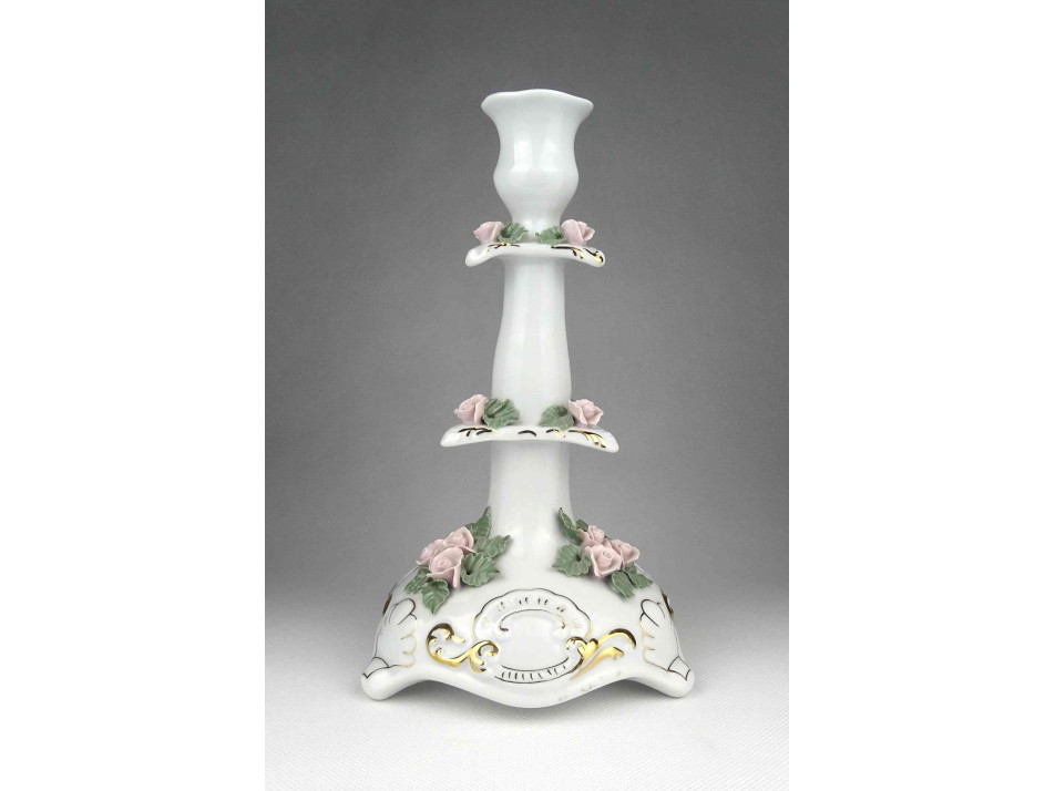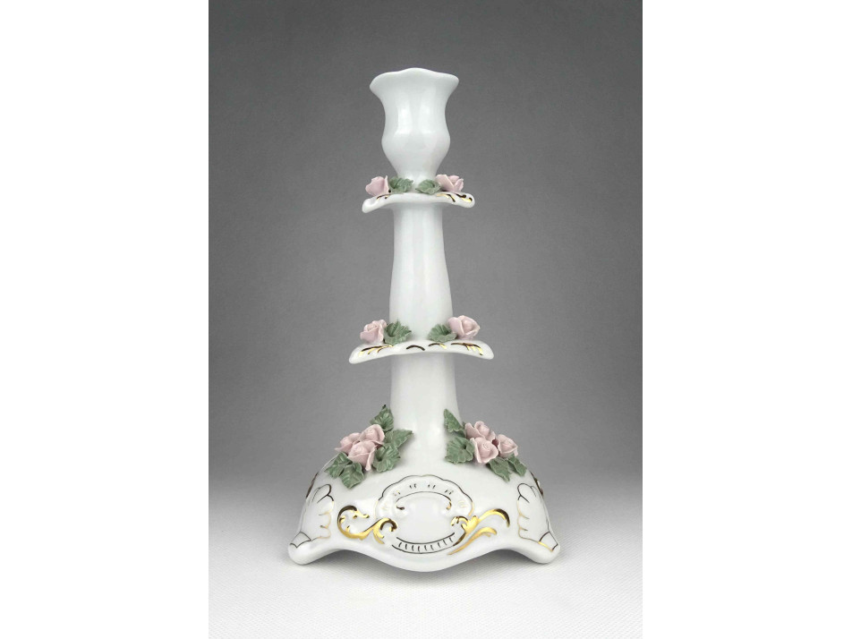 Hibátlan állapotú, nagyméretű, három lábon álló, apró plasztikus rózsákkal díszített, aranyozott, jelzett Apulum porcelán gyertyatartó.