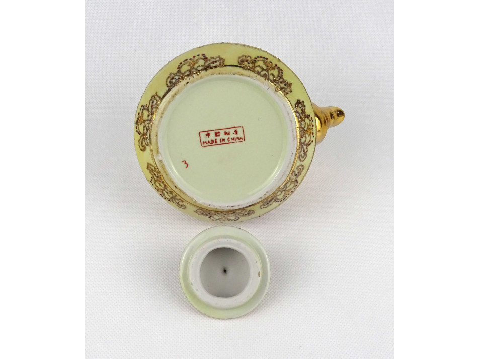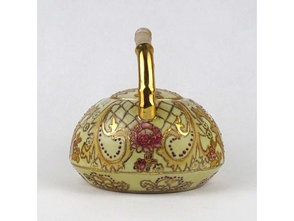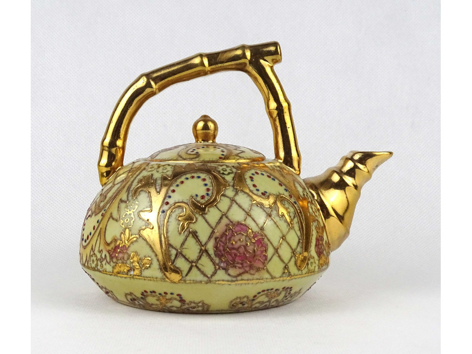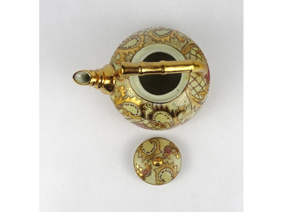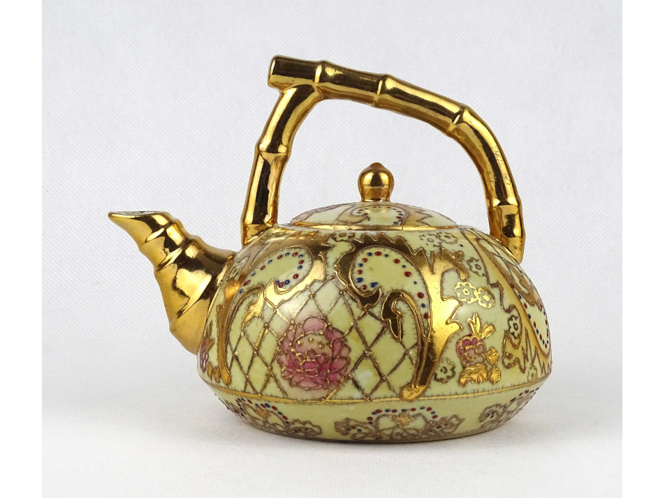 Régi hibátlan állapotú, jelzett, kisméretű kínai vagy keleti porcelán teáskanna gazdagon aranyozott virágmintás díszítéssel.