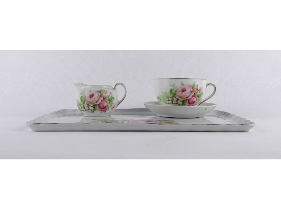 Régi rózsa mintás porcelán reggeliző készlet, teás vagy kávés készlet