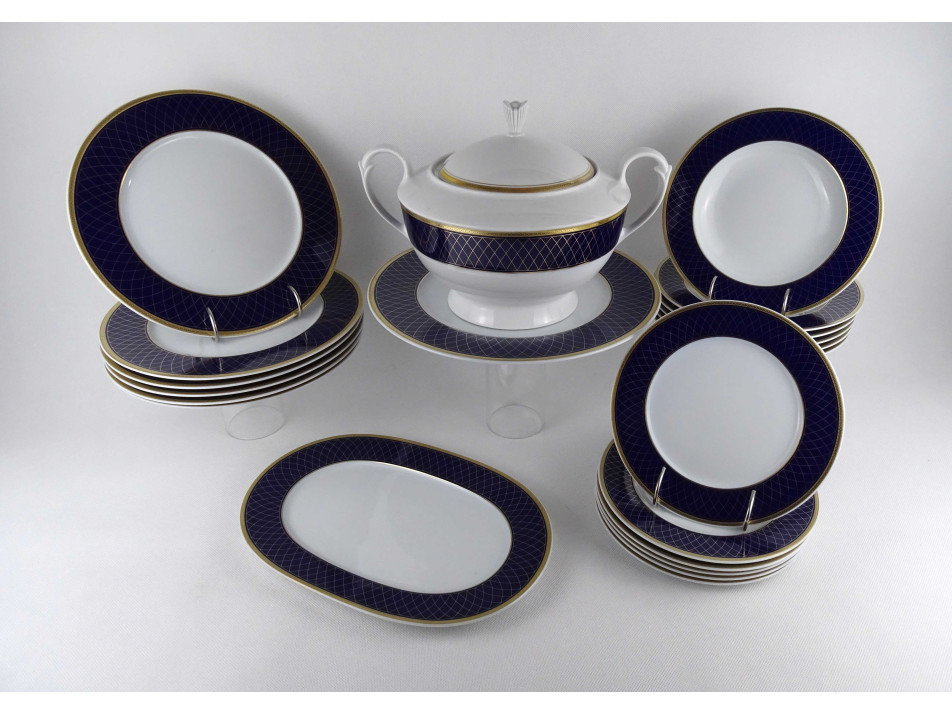 Hat személyes, aranyozott - kobaltkék szegélyű, magas minőségű Zepter Cobalt Royal porcelán étkészlet, eredeti dobozaiban. 21 darab.