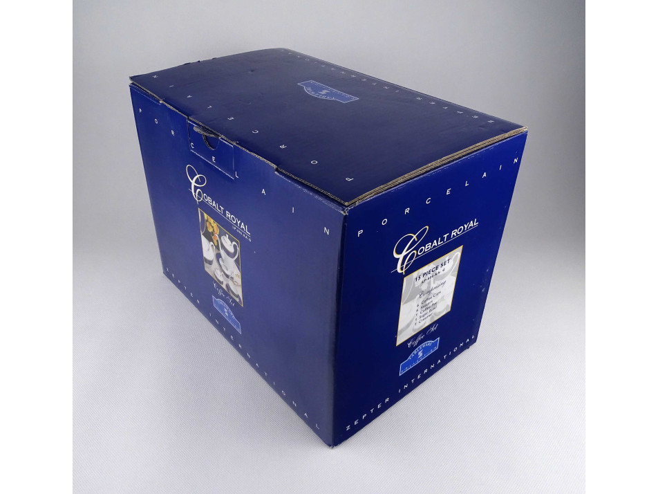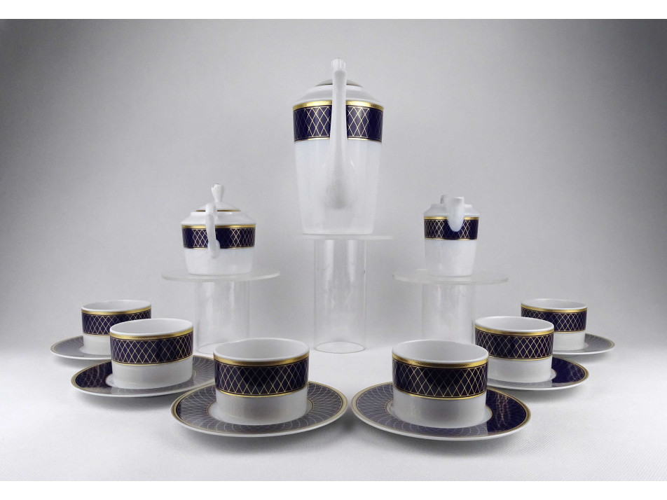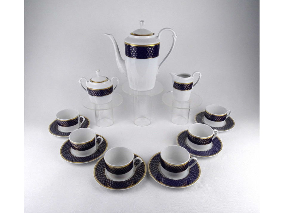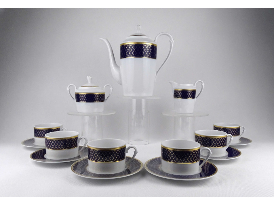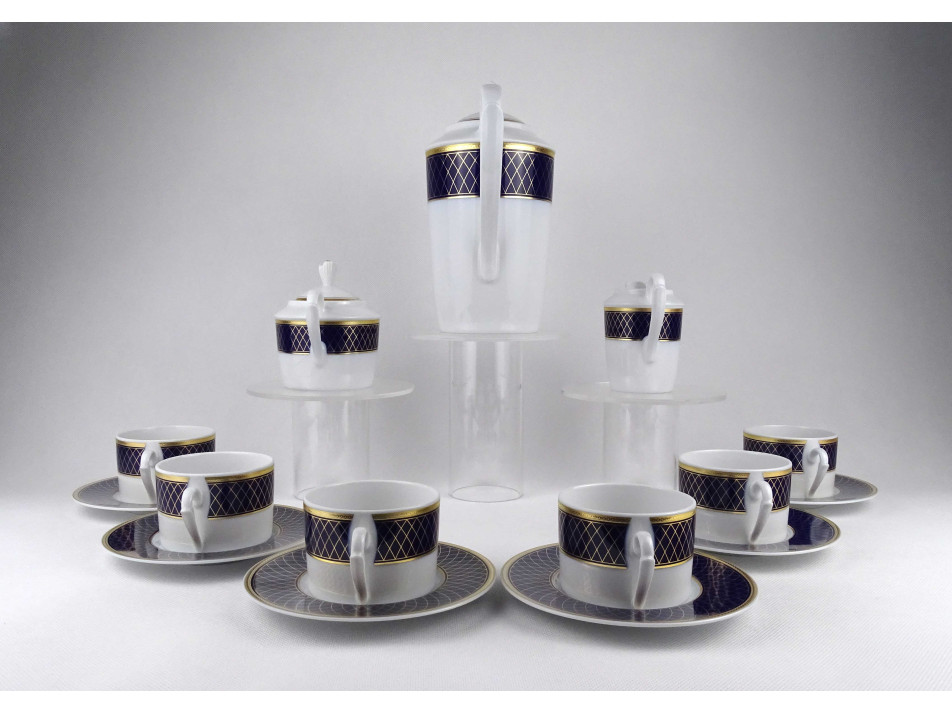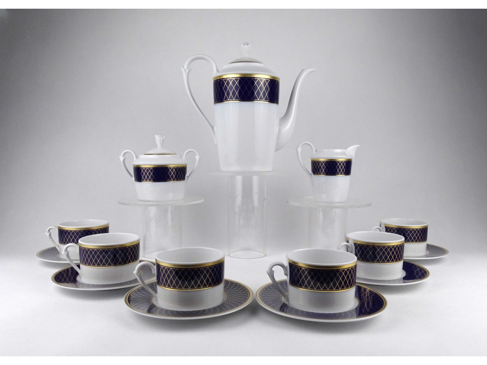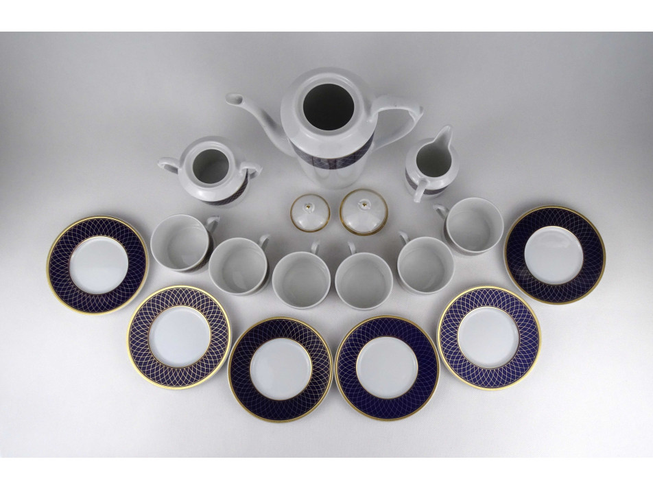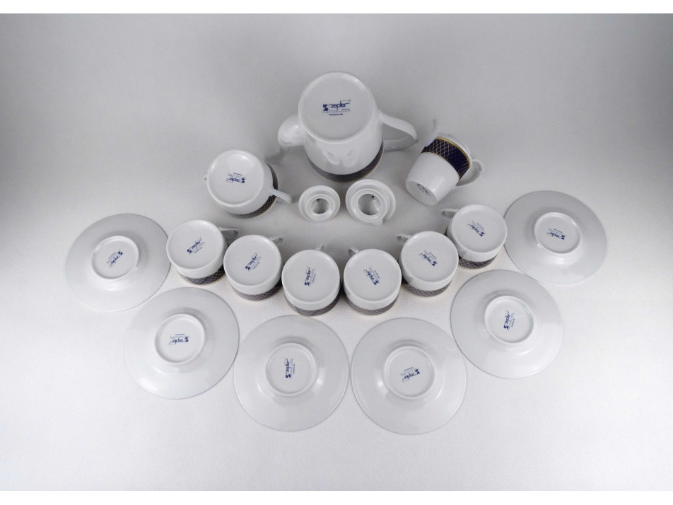 Hat személyes, aranyozott - kobaltkék szegélyű, magas minőségű Zepter Cobalt Royal porcelán kávés készlet, eredeti dobozában. 15 darab.