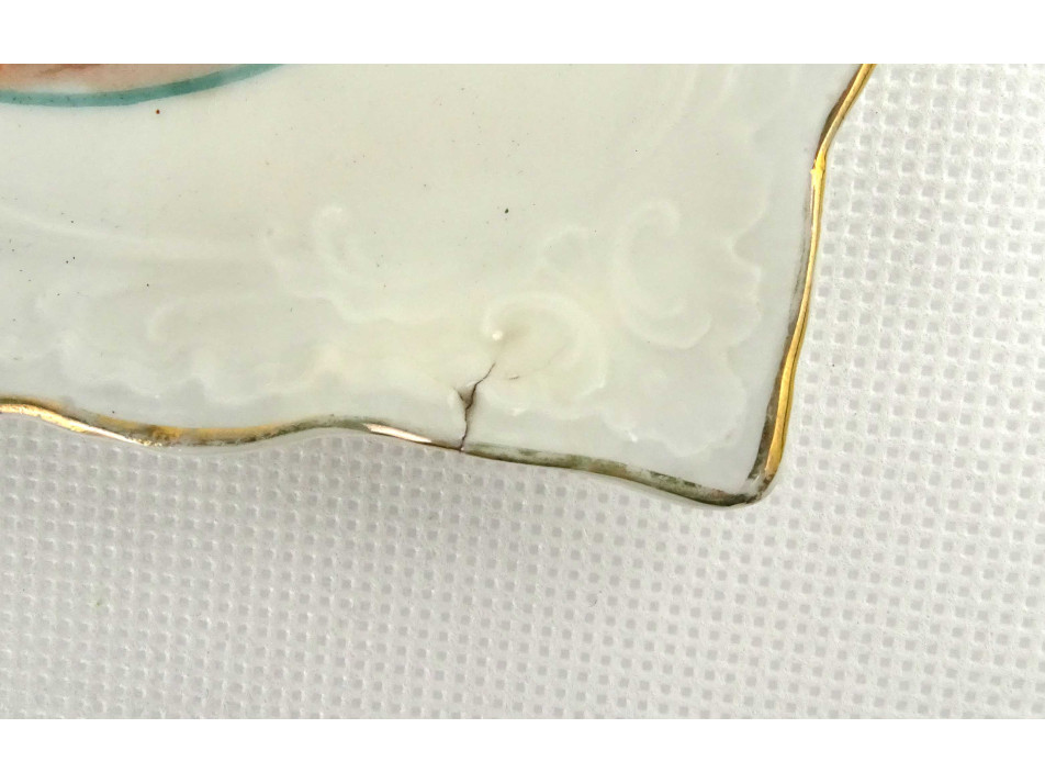 Régi vitrindísz, szép állapotú, jelzetlen, különleges levél alakú, aranyozott szélű, halványkék színű, közepén romantikus jelenettel díszített porcelán tányérkészlet, süteményes készlet, 6 darab.