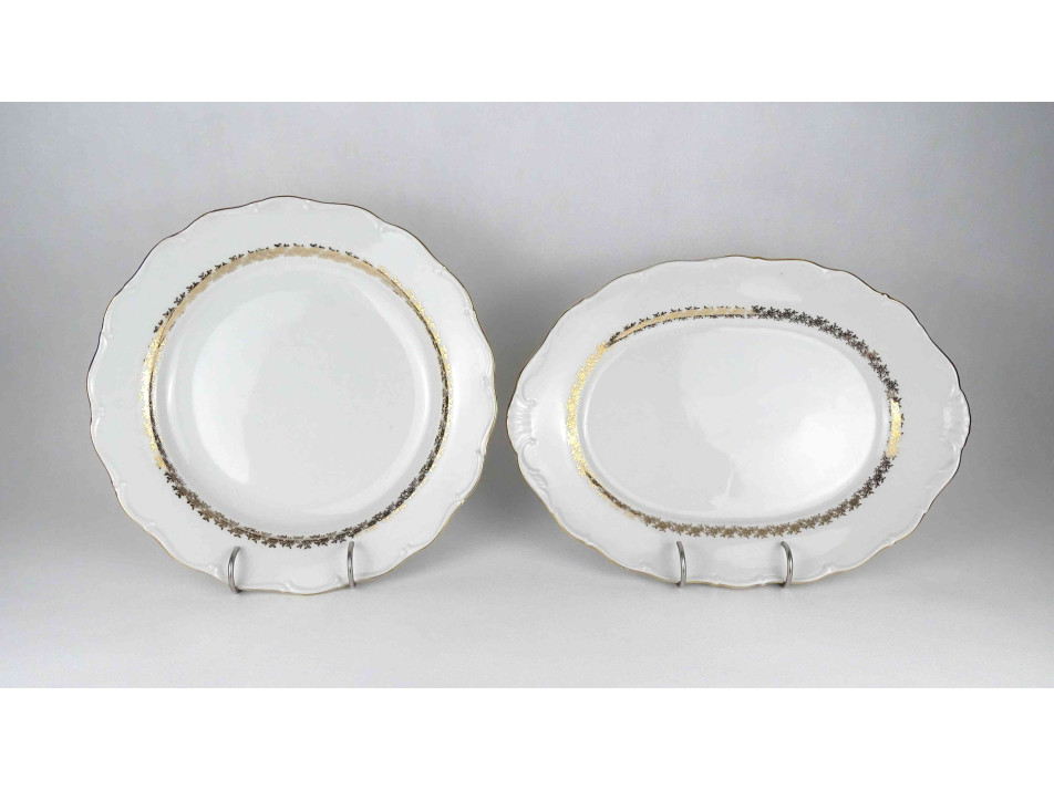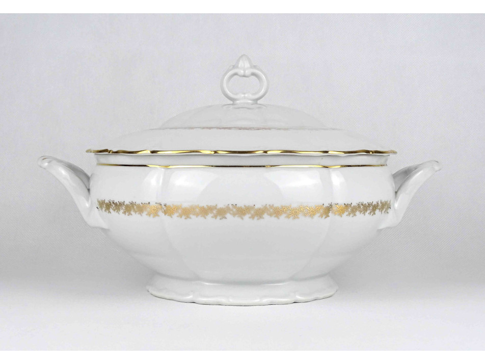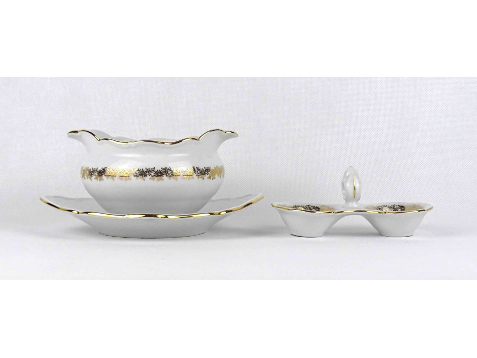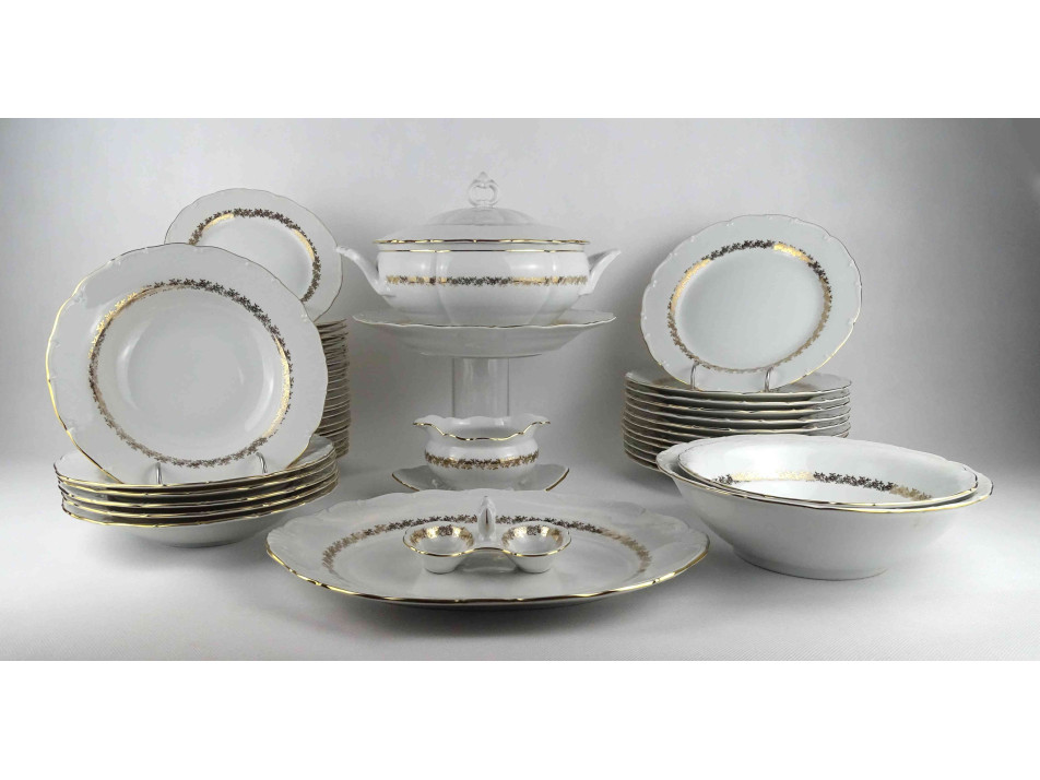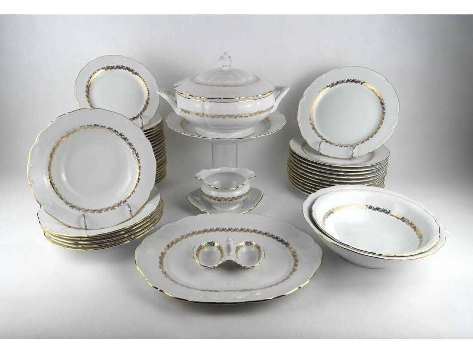 Gyönyörű, hibátlan állapotú, barokkos formavilágú, aranyozott virágmintás díszítésű, hat személyes 48 darabos, jelzett cseh Haas & Czjzek porcelán étkészlet.