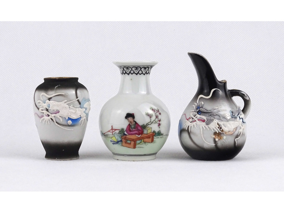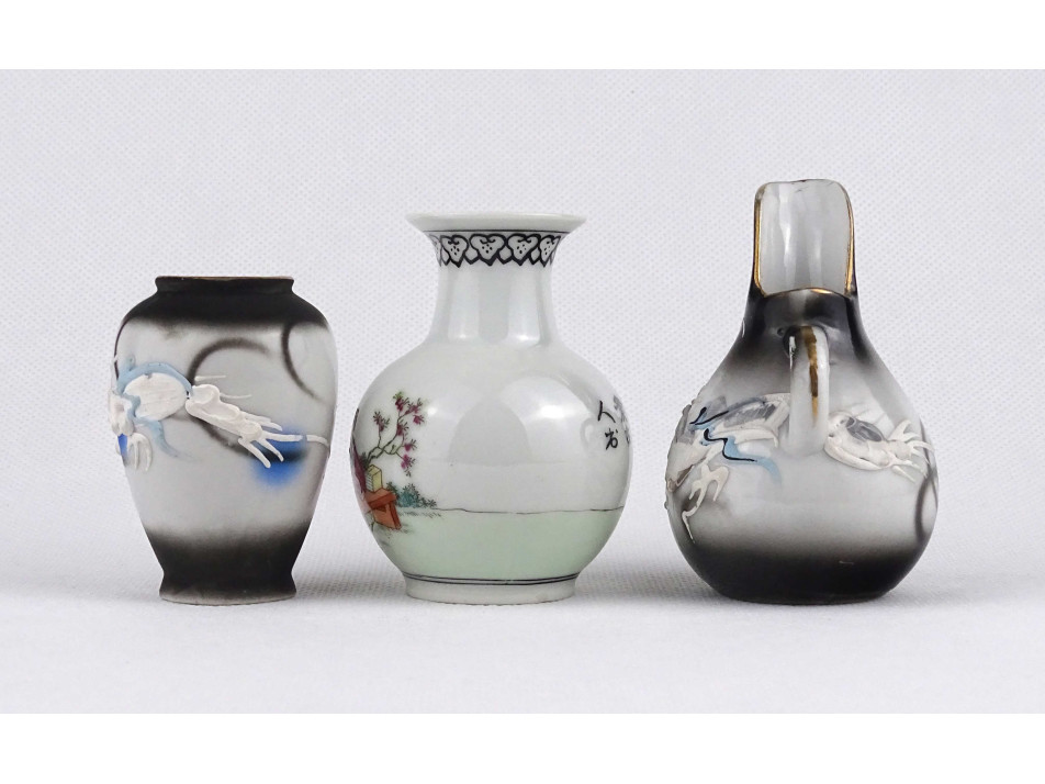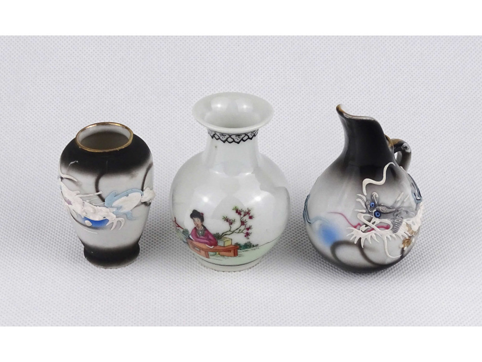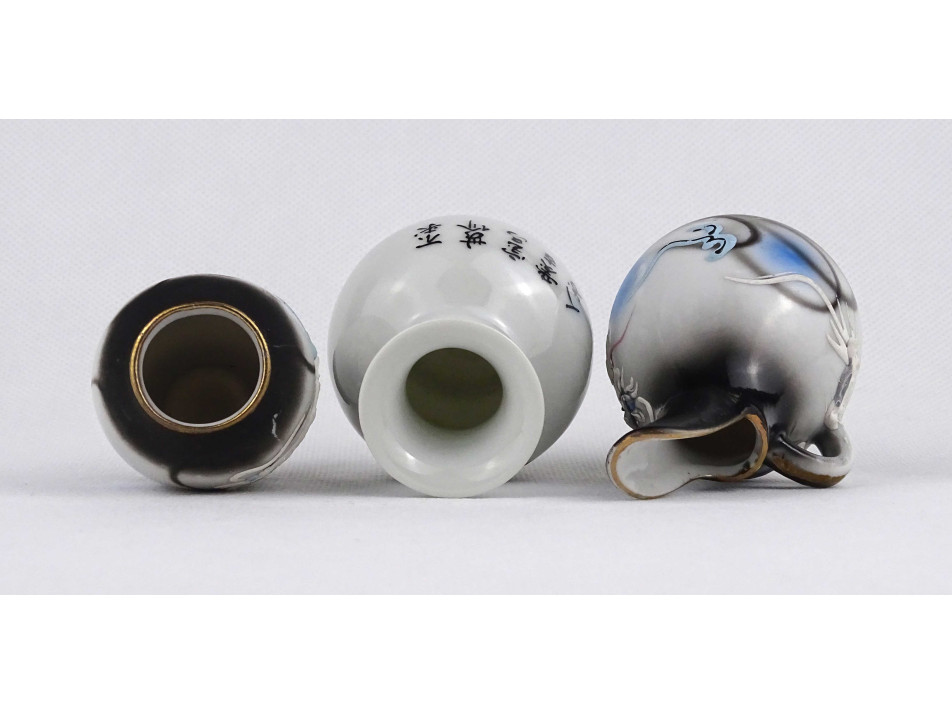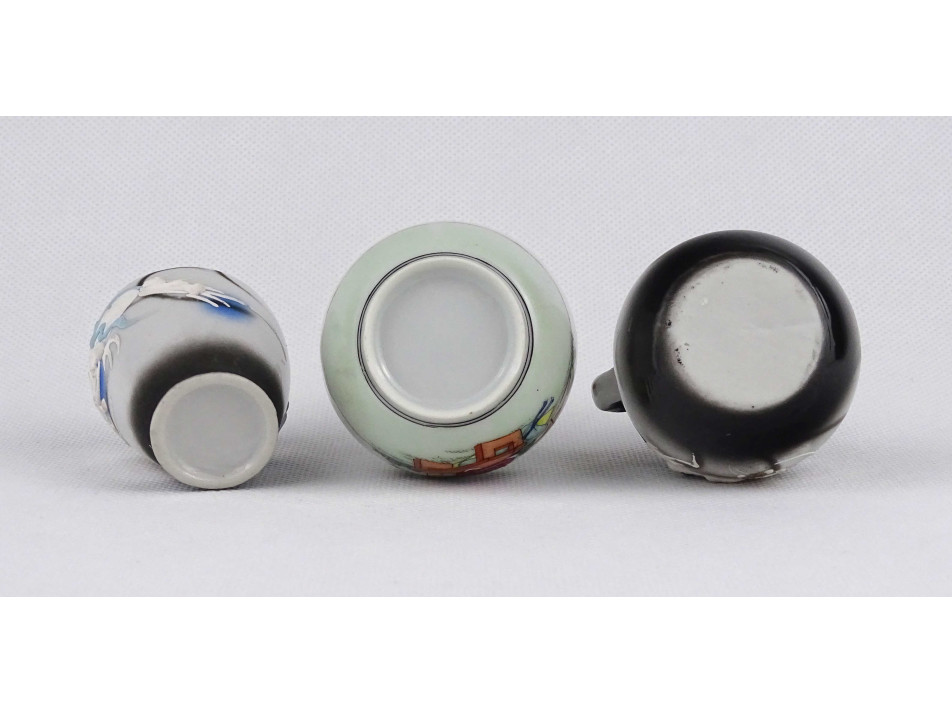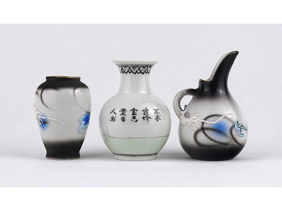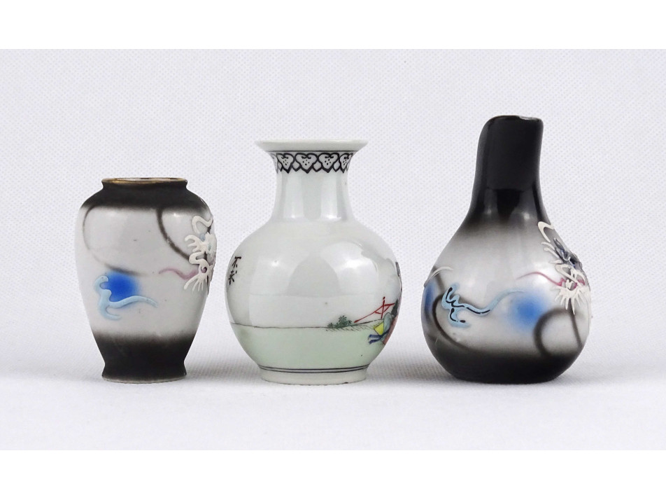 Régi, jelzetlen, távol - keleti, kínai kézzel festett porcelán kisváza csomag, 3 darab egyben.