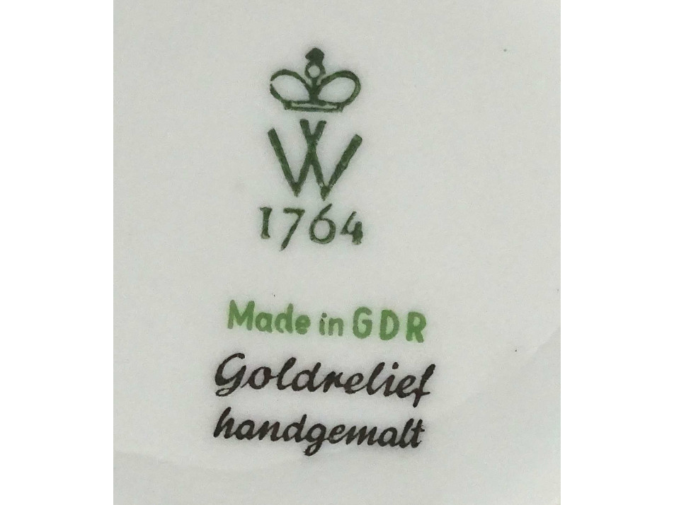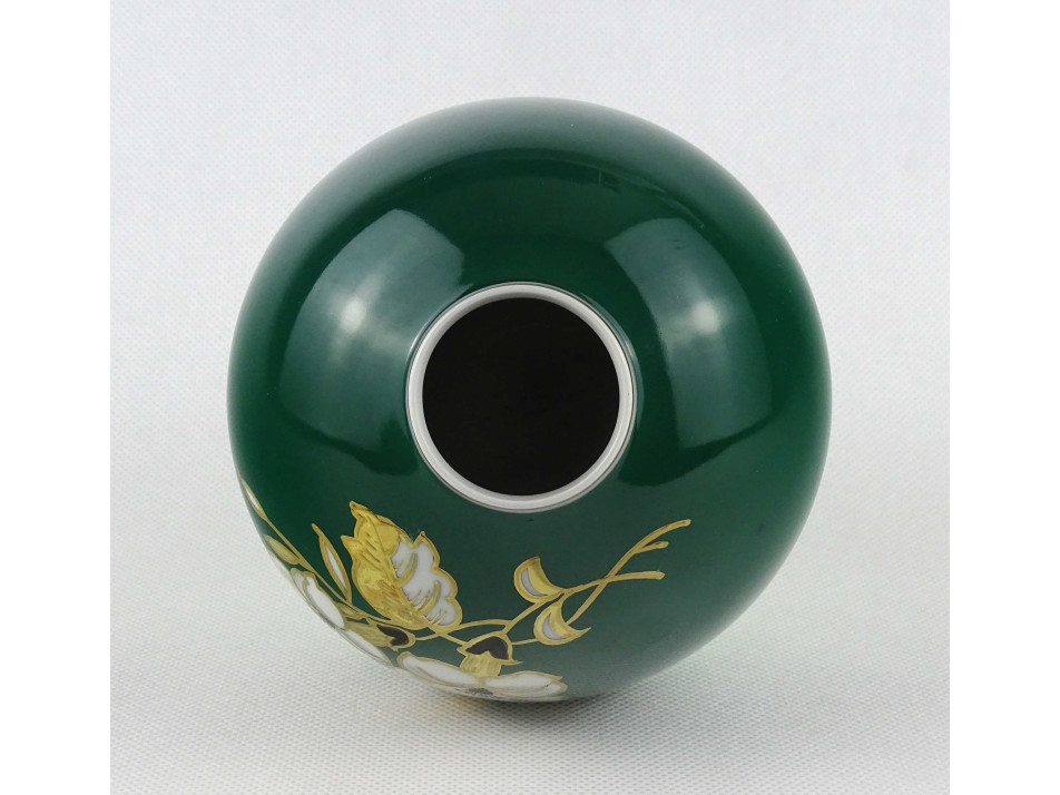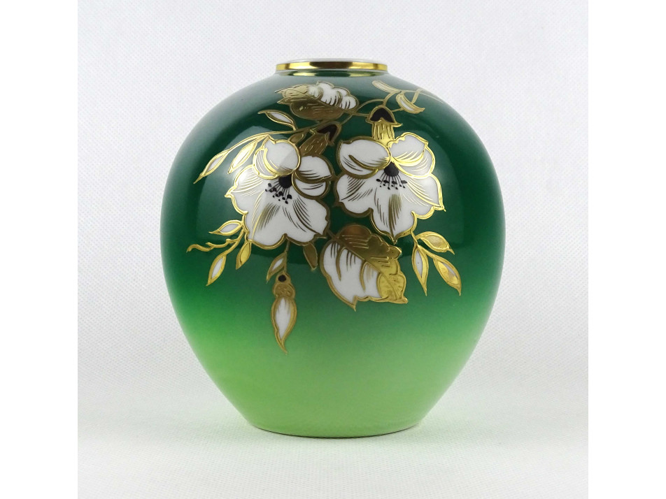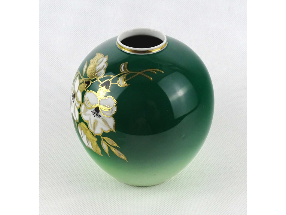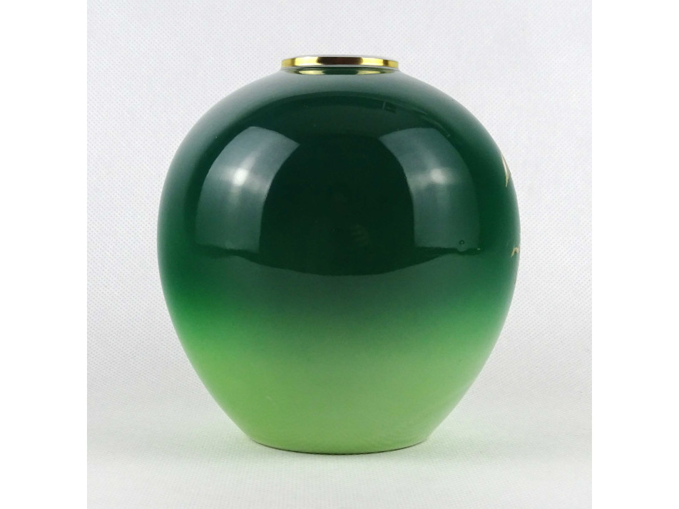 Hibátlan állapotú, öblös, gömb alakú, zöld színű, gazdagon aranyozott, virág díszes, jelzett Wallendorf porcelán váza, díszváza.