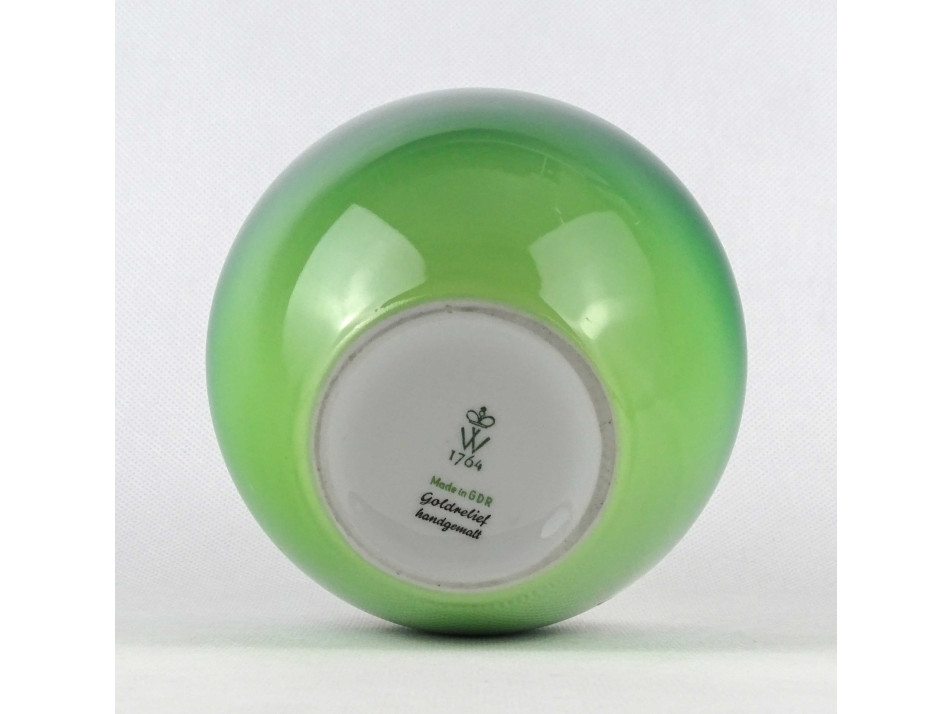Régi zöld arany színű Wallendorf porcelán gömb váza 13.6 cm
