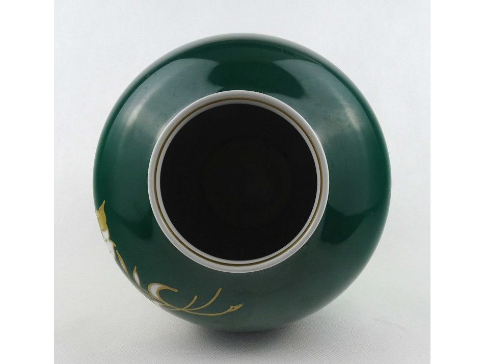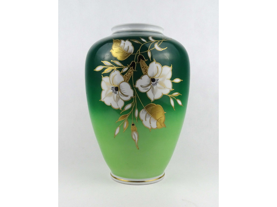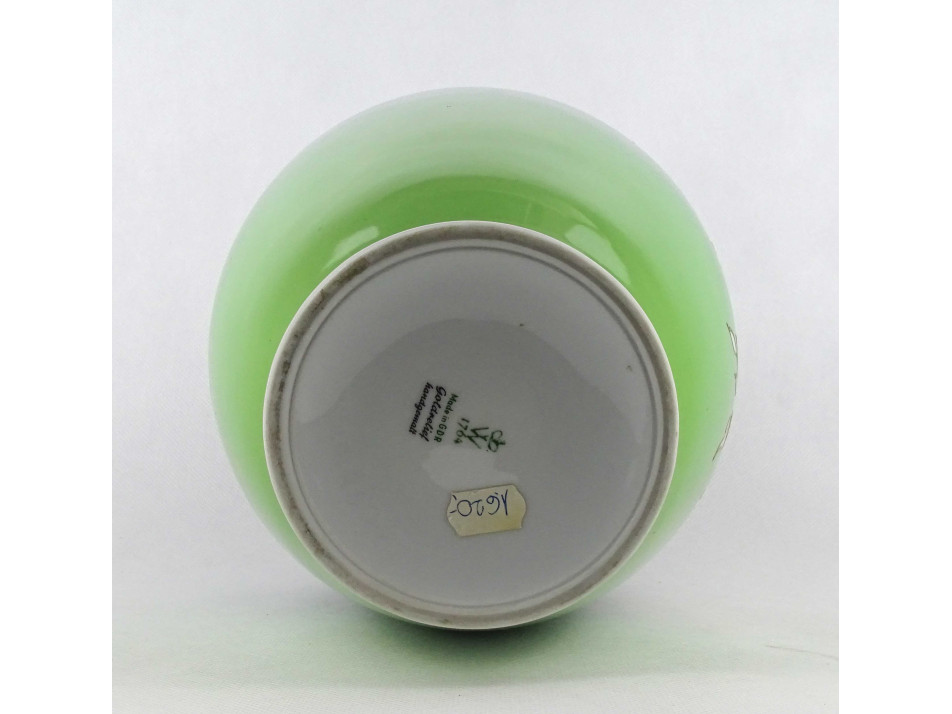 Hibátlan állapotú, nagyméretű, öblös, zöld színű, gazdagon aranyozott, virág díszes, jelzett Wallendorf porcelán váza, díszváza.