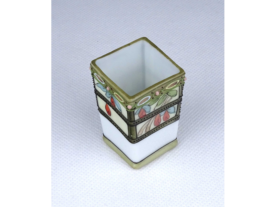 Régi, hibátlan állapotú, kisméretű jelzett japán porcelán kisváza. Kidomborodó, plasztikus kézifestésű virágmintával, növényi motívumokkal díszített, szögletes alakú, díszváza.