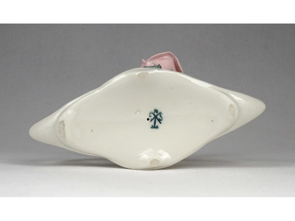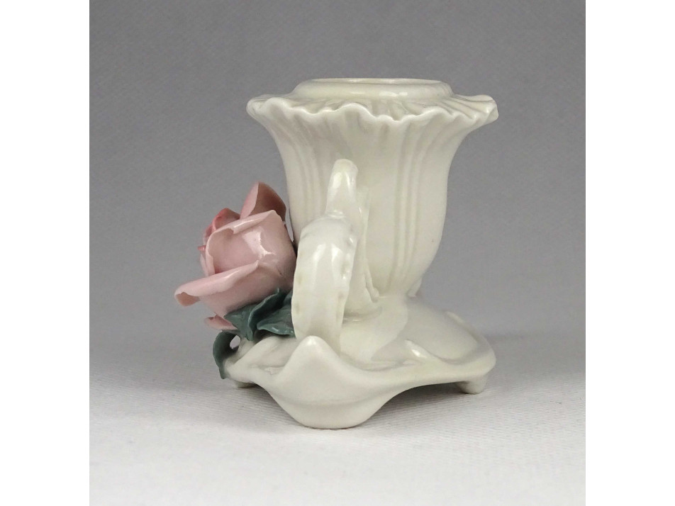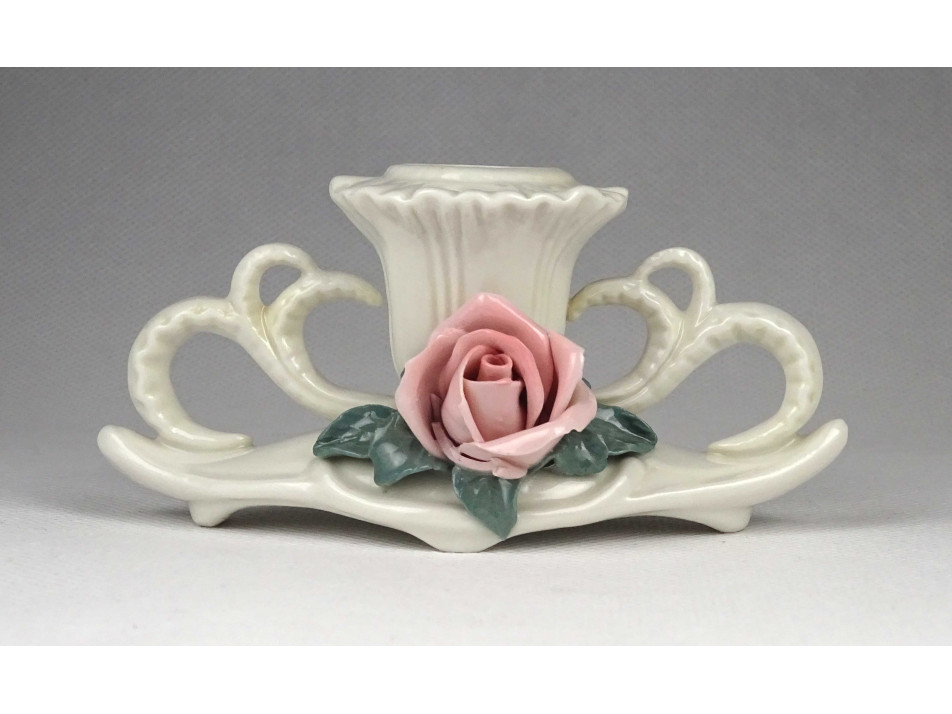 Régi, szép állapotú, kis méretű, német Ens porcelán gyertya tartó, rajta középen plasztikus rózsa díszítéssel. A rózsa szirmain apró lepattanások láthatók.