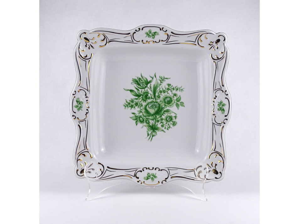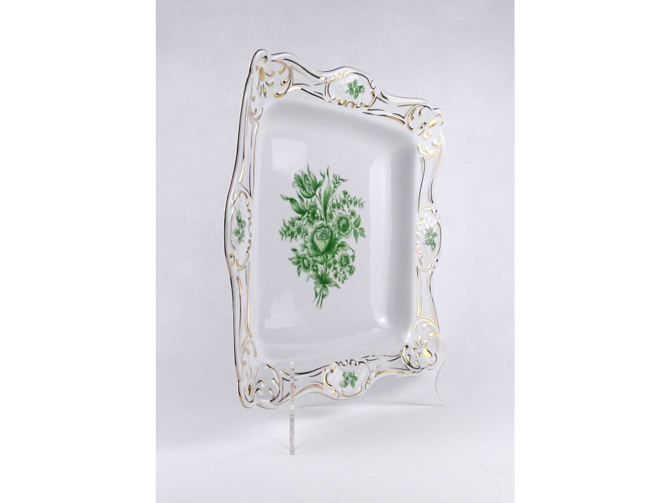 Hibátlan állapotú, gazdagon aranyozott, szögletes alakú, nagyméretű Hollóházi porcelán asztalközép, kínáló tál, gyümölcskínáló. Aranyozása kopásmentes, ajándékba adható!