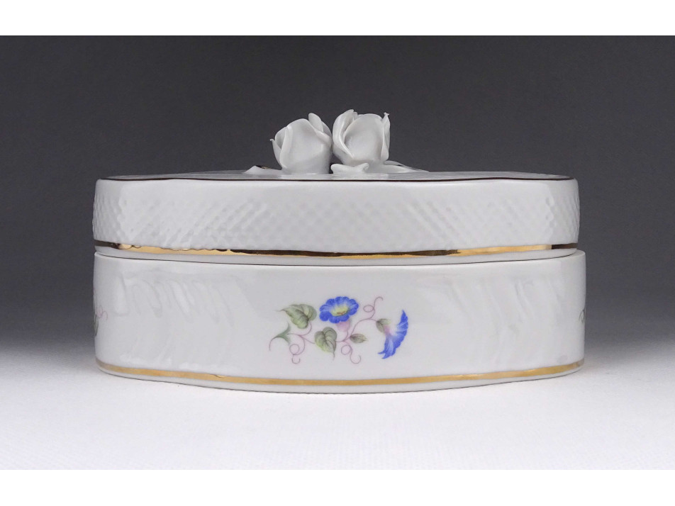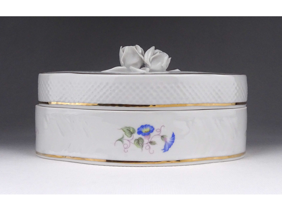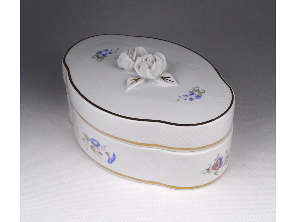 Hibátlan állapotú, gazdagon aranyozott, ovális alakú Hollóházi porcelán bonbonier, gyűrűtartó, ékszertartó, tetején dupla rózsa díszítéssel.