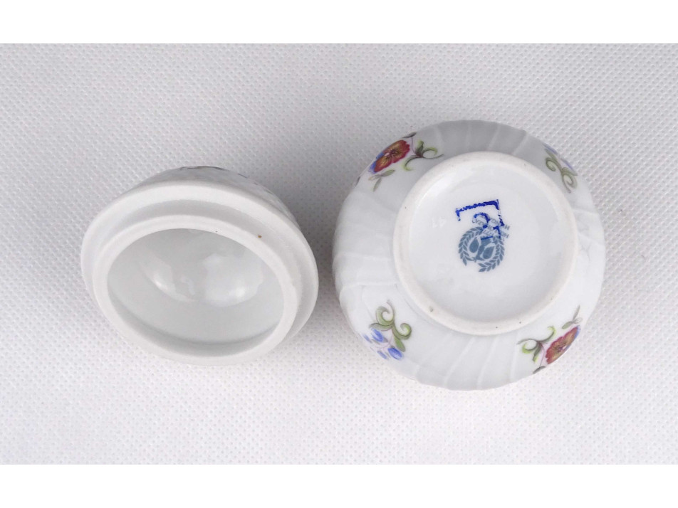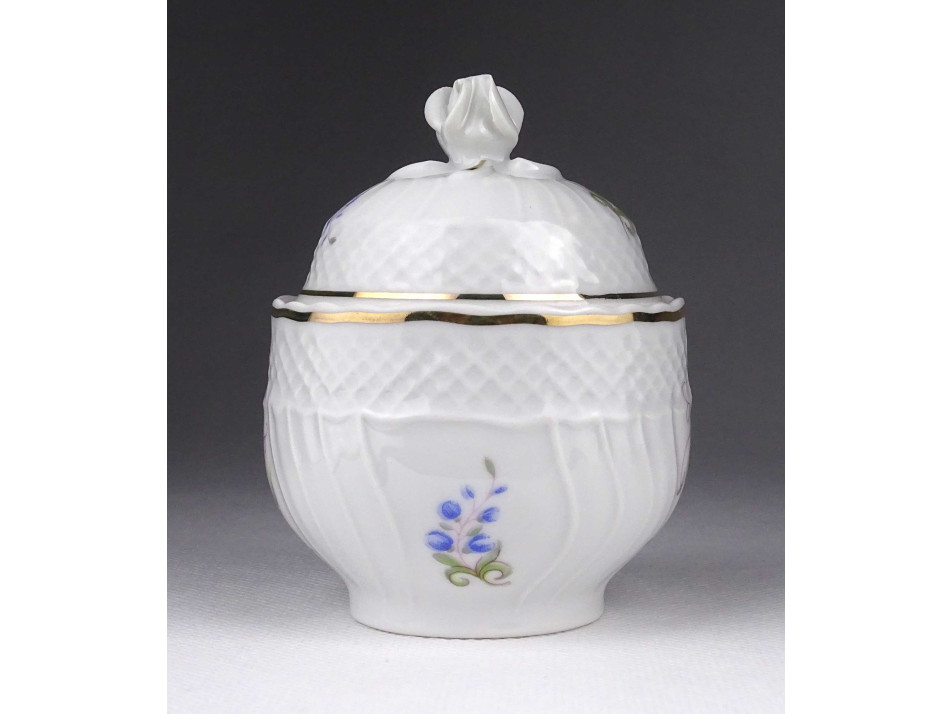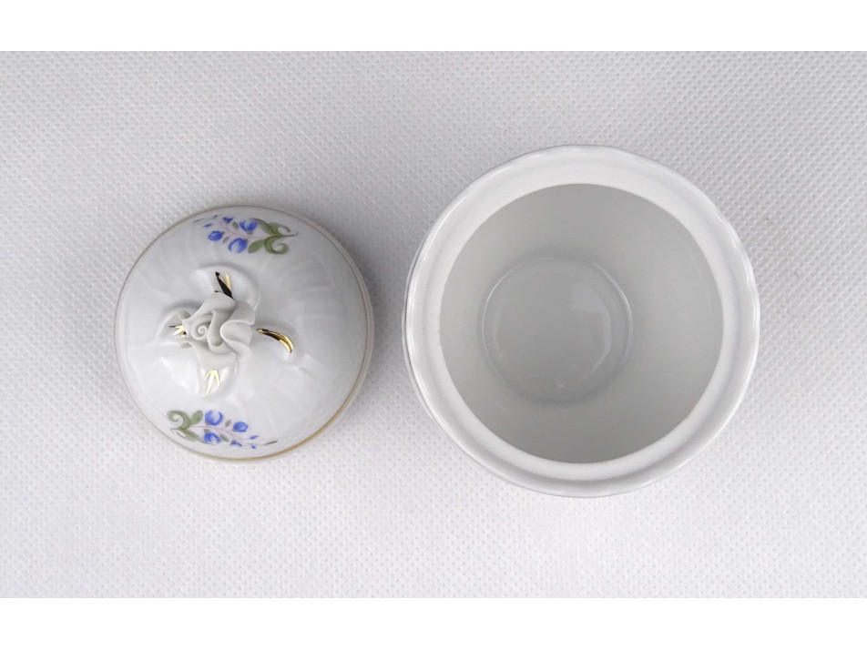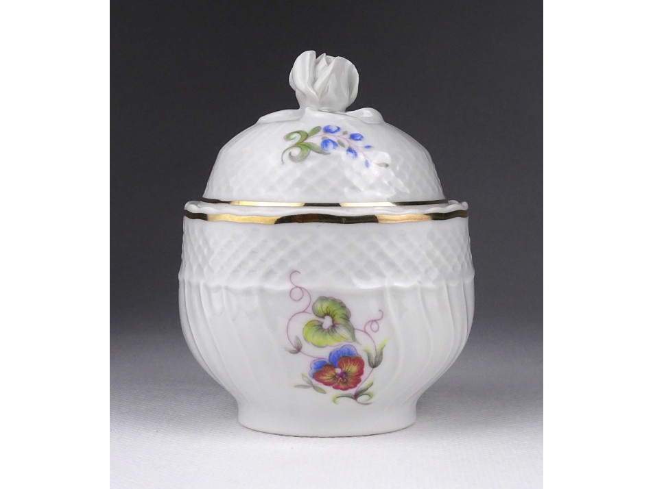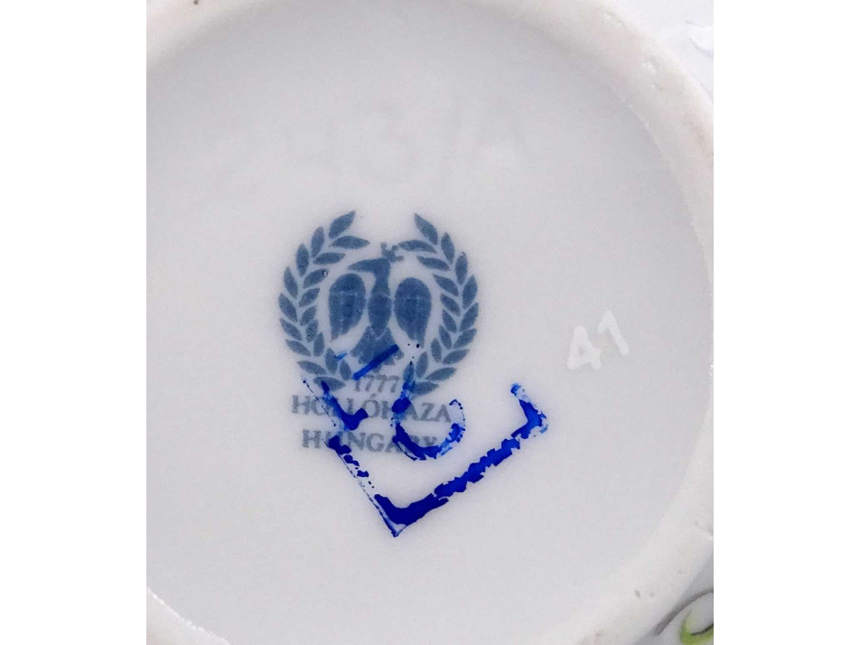 Hibátlan állapotú Hajnalka mintás hollóházi porcelán bonbonier. Tetején rózsadíszítés látható.