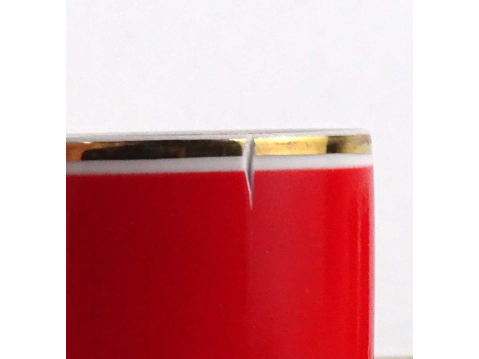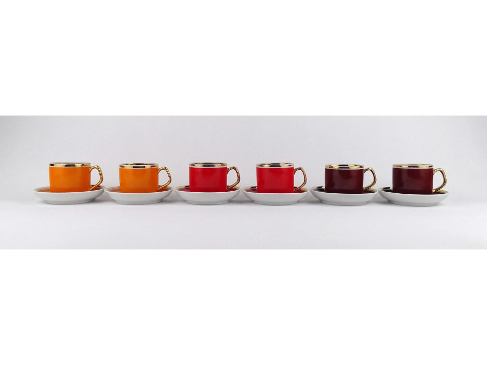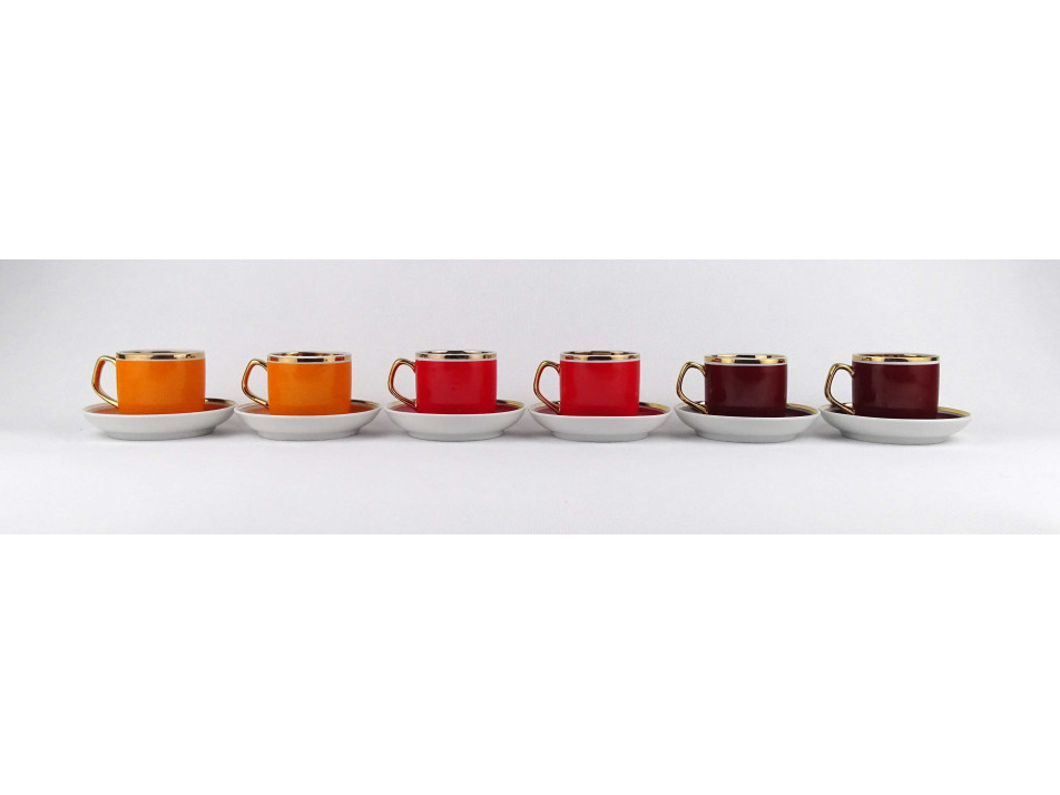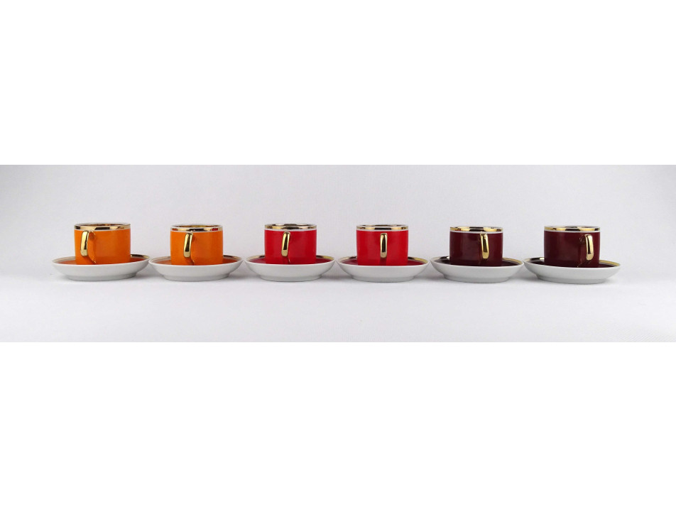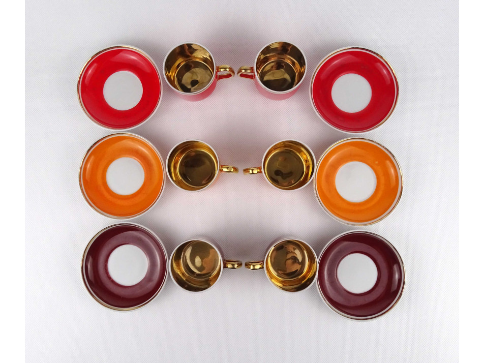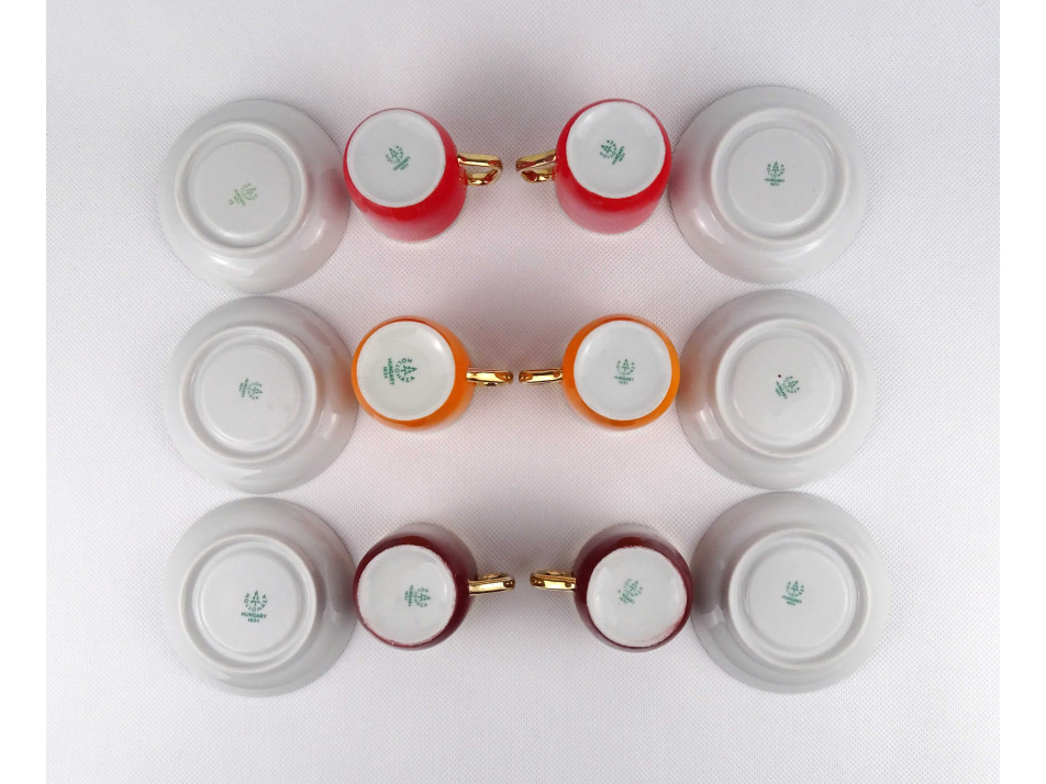 Retro, színes, aranyozott szélű Hollóházi porcelán kávés készlet. A csészék belülről vastagon aranyozottak. Az egyik piros csészének külső peremén egy repedés, anyaghiány található. Lásd fotók.
