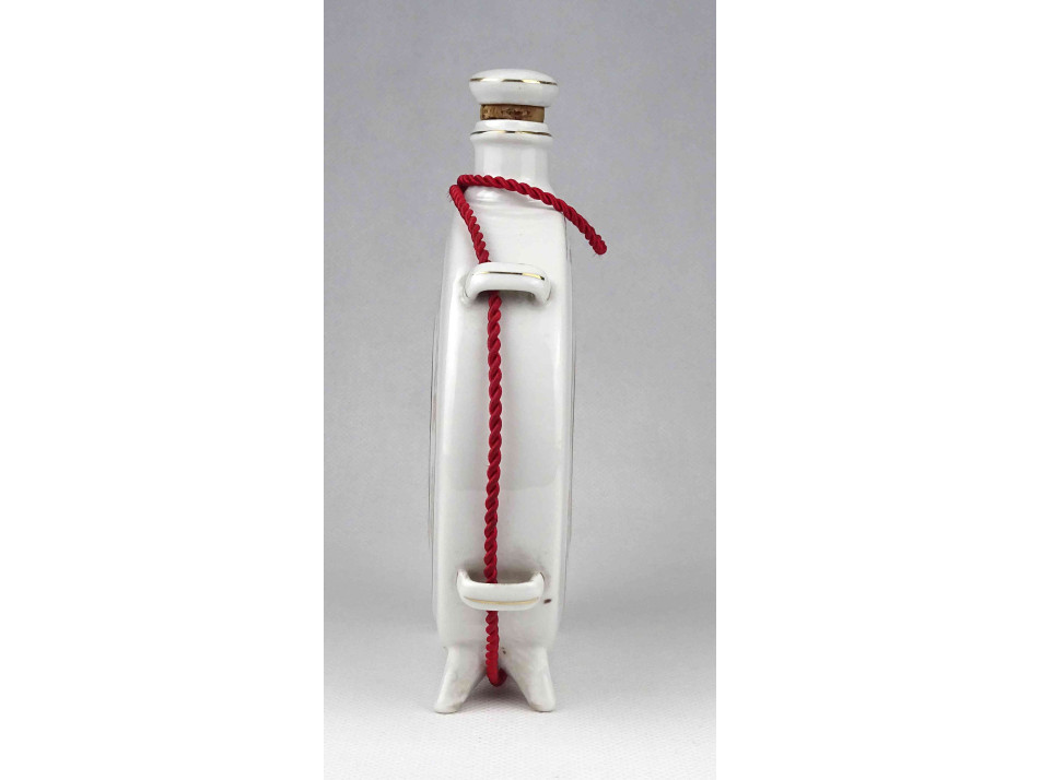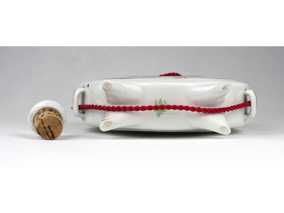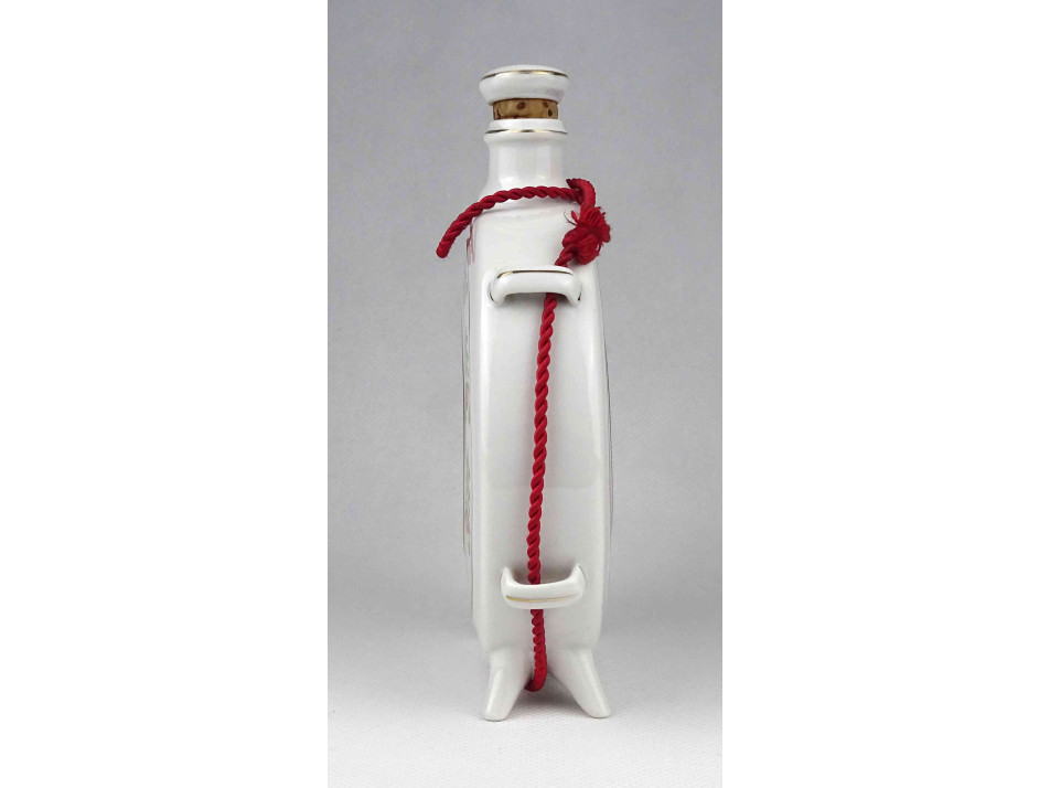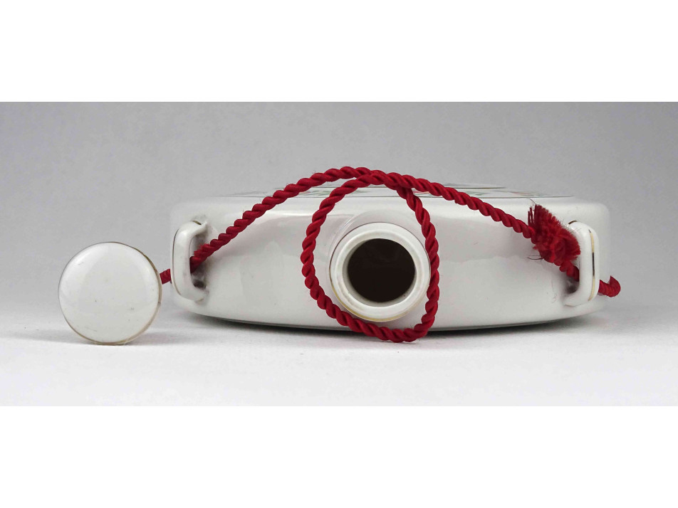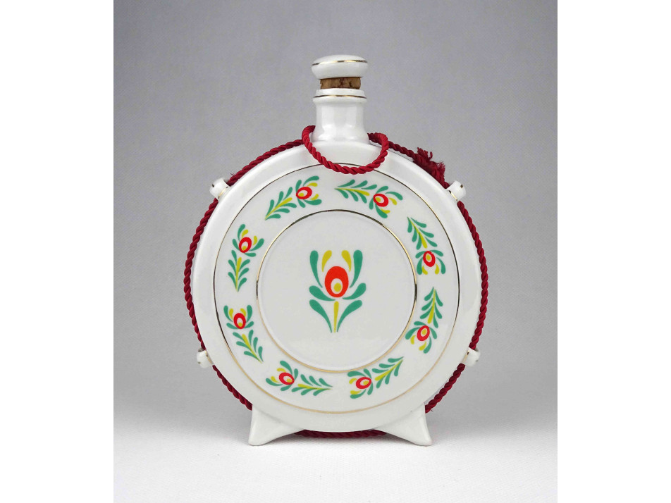 Régi, hibátlan állapotú Hollóházi porcelán kulacs, pálinkás butella, oldalán virágmintás népi motívumos díszítések és felirat.