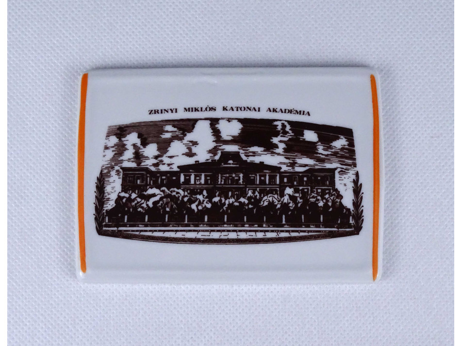 Régi, hibátlan állapotú, a Zrínyi Miklós Katonai Akadémia által megrendelt téglalap alakú Hollóházi porcelán emlékplakett eredeti papír dobozában. Rajta felirat és az akadémia épületének látképe látható.
