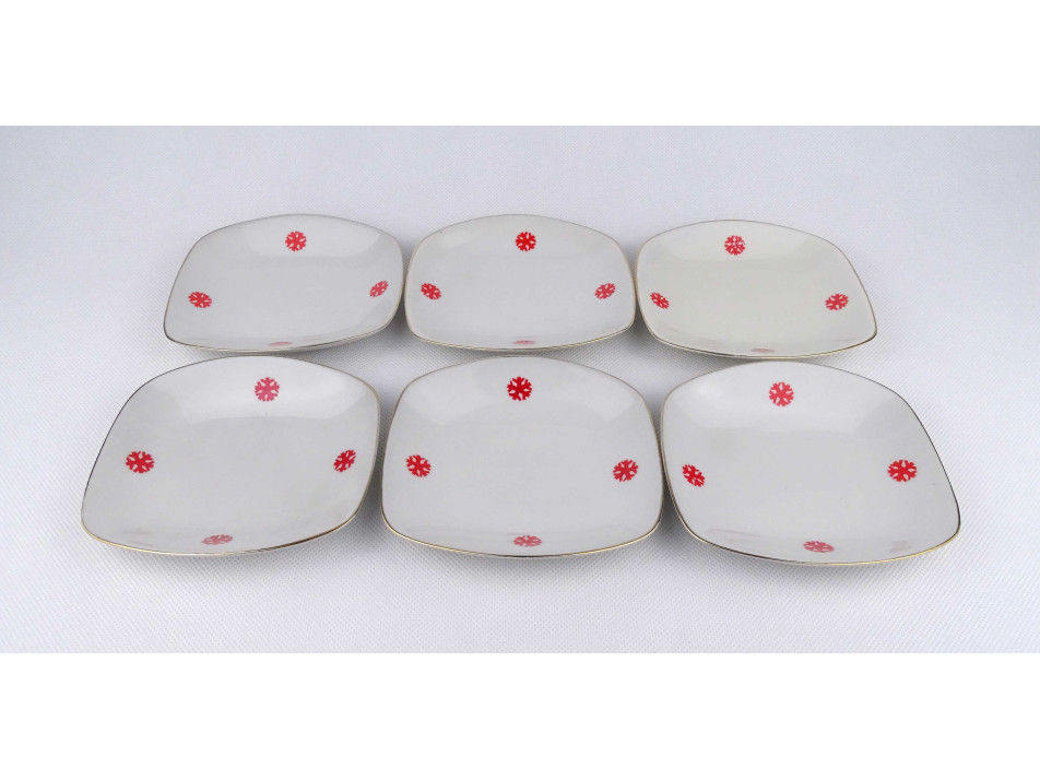 Retro, hibátlan állapotú, aranyozott szélű, piros hópehely mintával díszített modern, szögletes alakú süteményes porcelán tányér készlet. 6 darab.