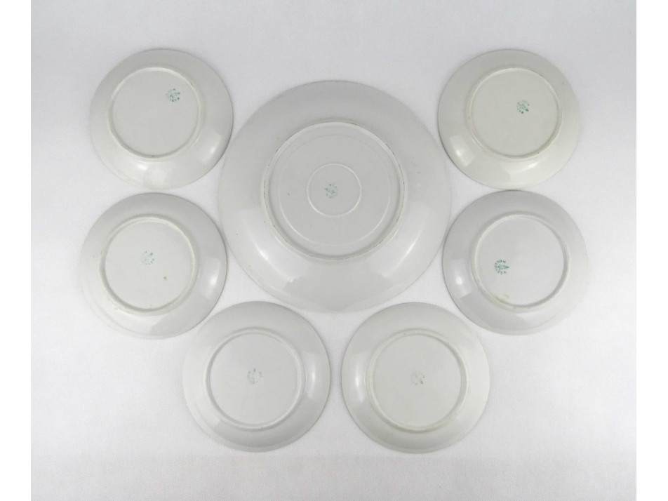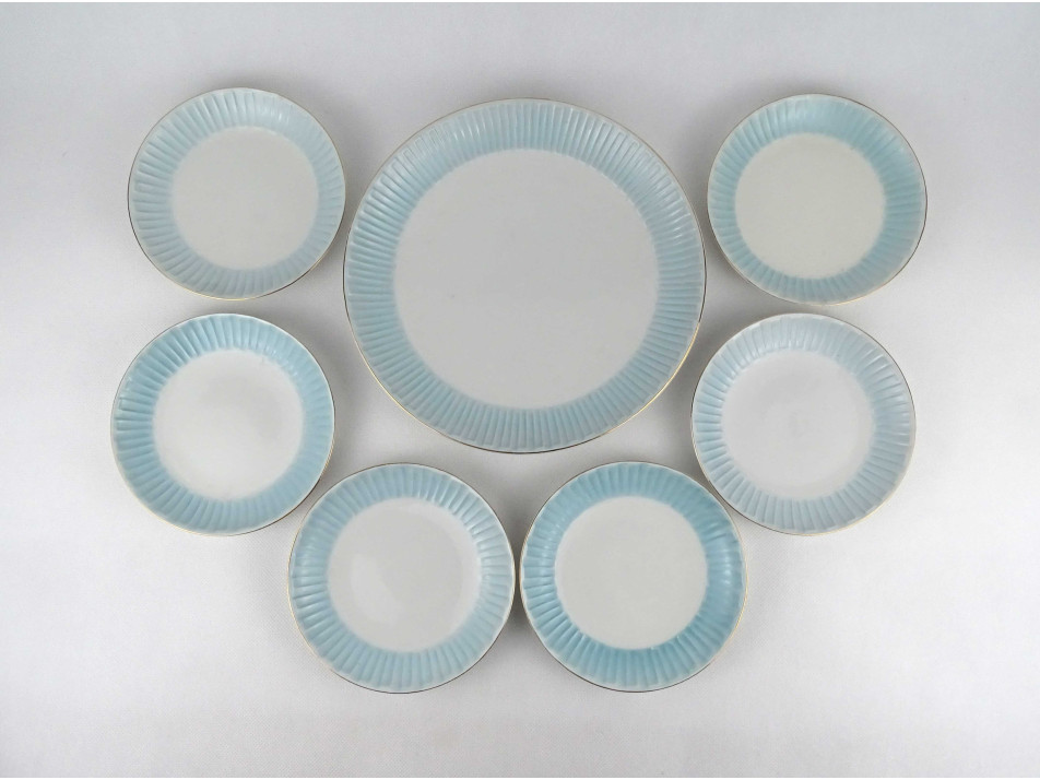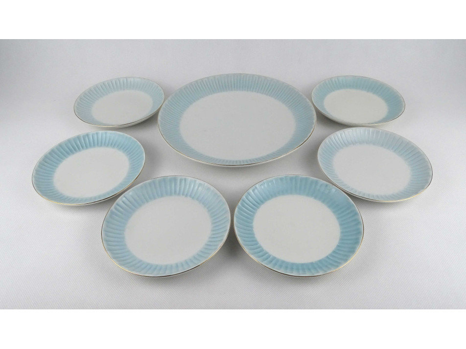 Régi halványkék peremű süteményes tortás Hollóházi porcelán készlet 7 darab