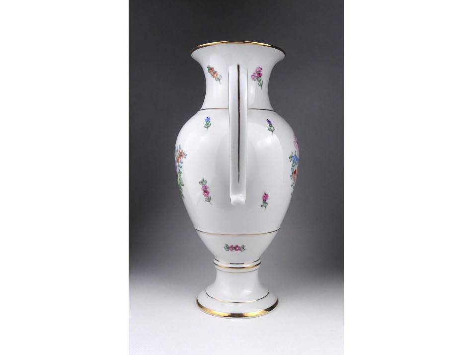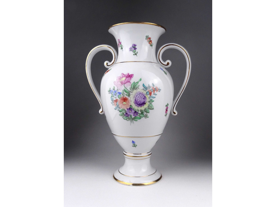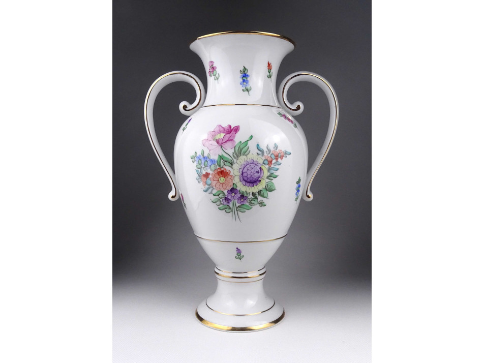 Nagyméretű, virágmintás, aranyozott Hollóházi porcelán díszváza, amfóra váza. Alsó peremén egy apró lepattanás látható.