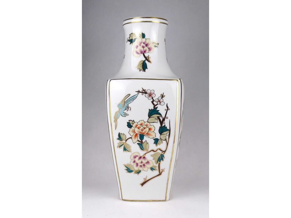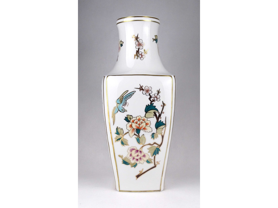 Hibátlan állapotú, virág és madár díszes, szögletes Hollóházi porcelán váza.