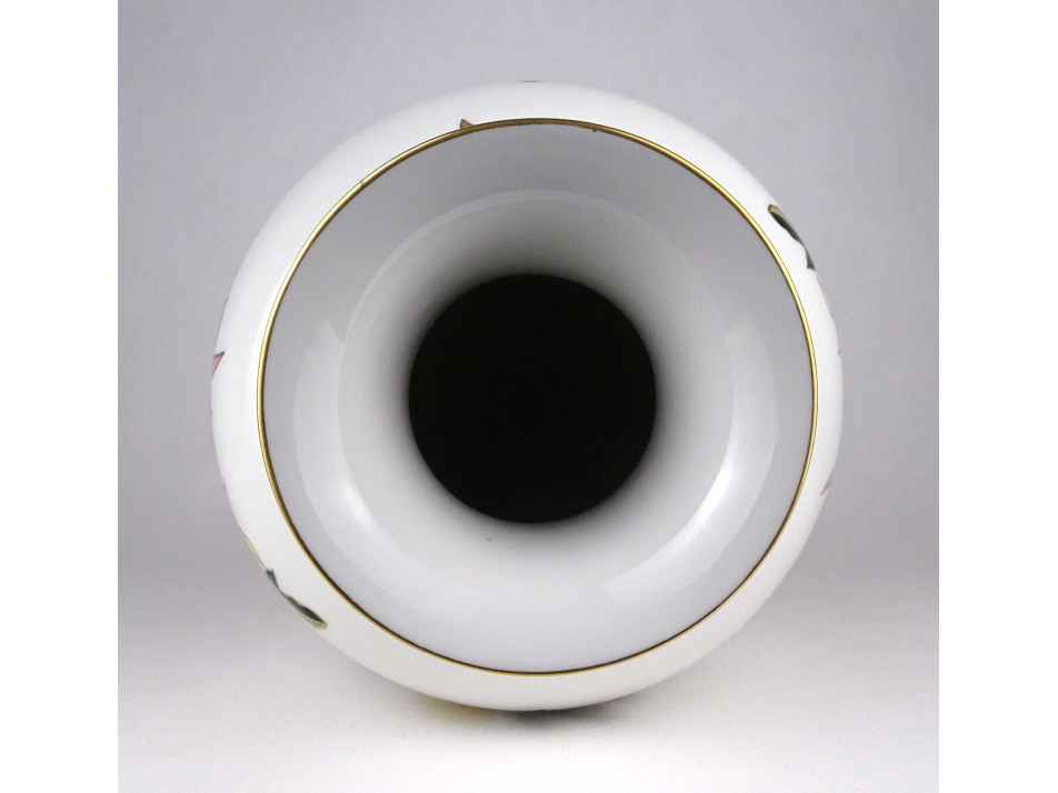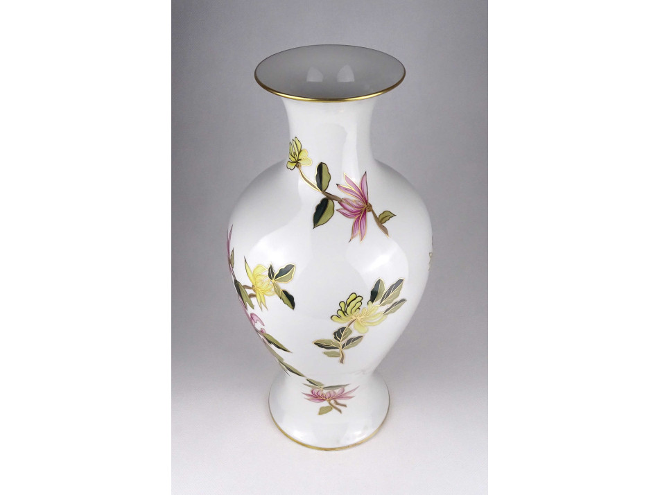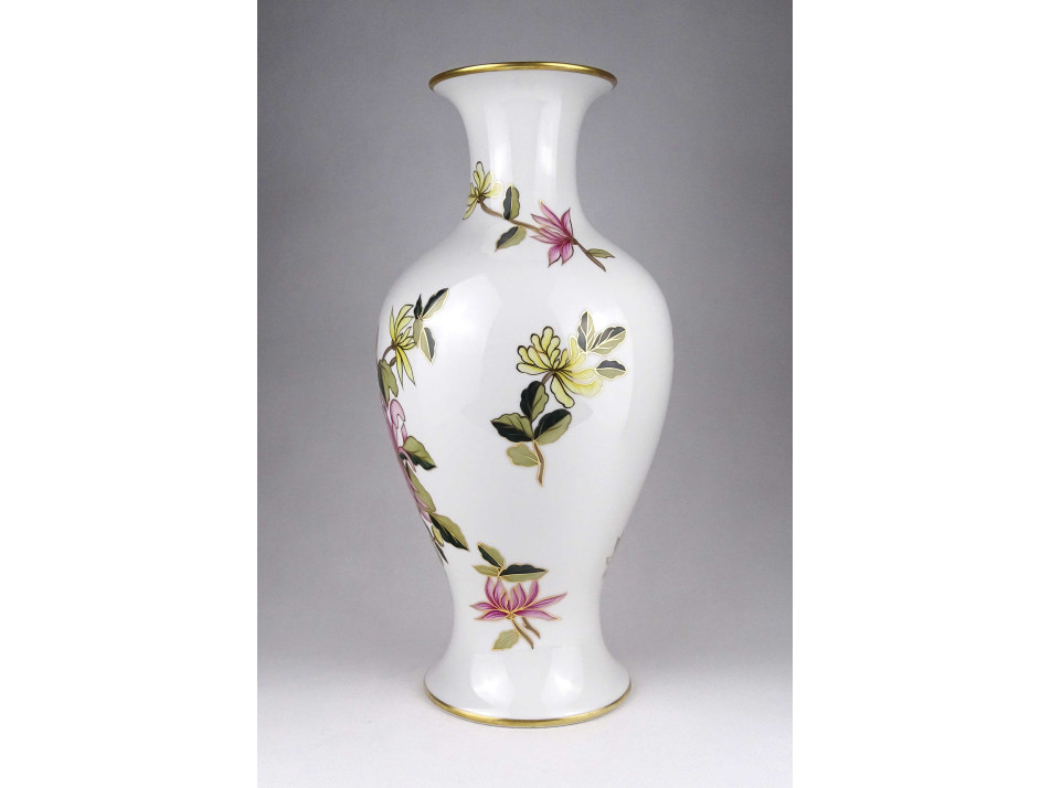 Hibátlan állapotú, gazdagon díszített, ritkán előforduló, nagyméretű, kézzel festett virágmintás, jelzett Hollóházi porcelán váza, virágváza.