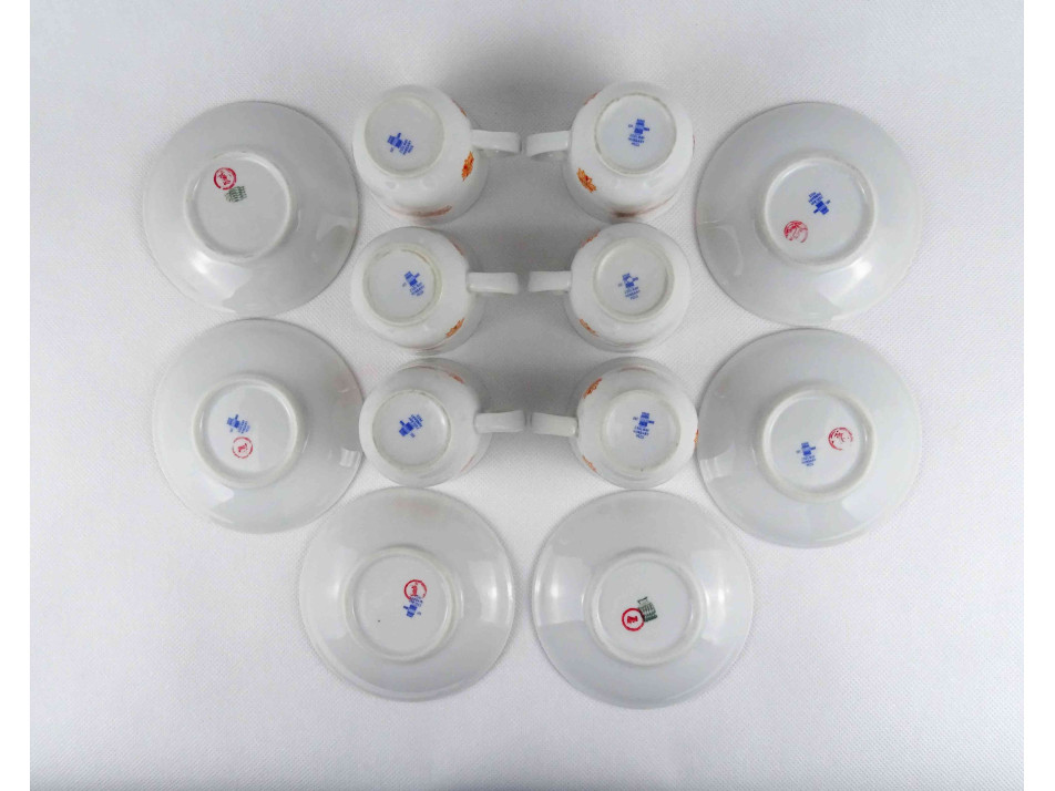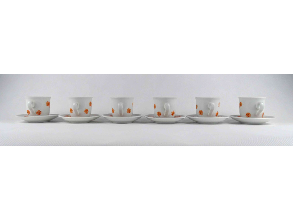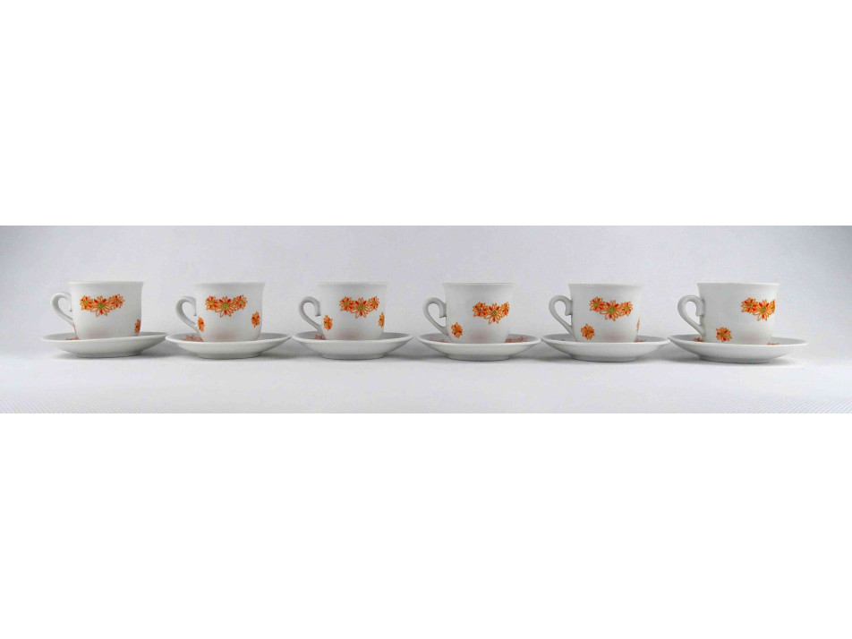 Régi, hibátlan állapotú, vastagfalú narancssárga virágmintás, jelzett Zsolnay porcelán kávéskészlet. 12 darab.