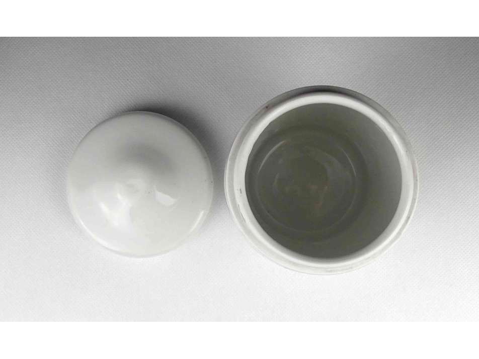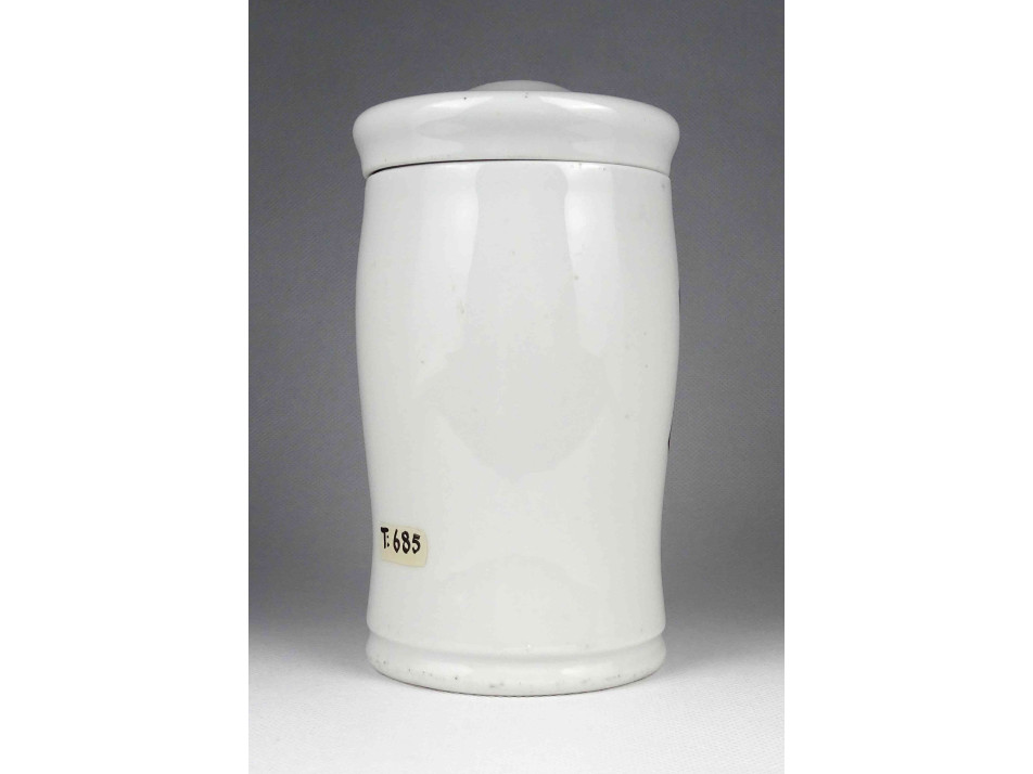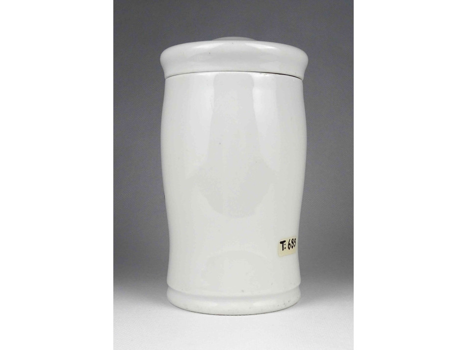 Hibátlan állapotú, nagyméretű gyógyszertári patika edény, tároló. Vastagfalú Zsolnay porcelán tégely, porcelán fedéllel.