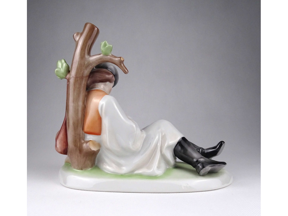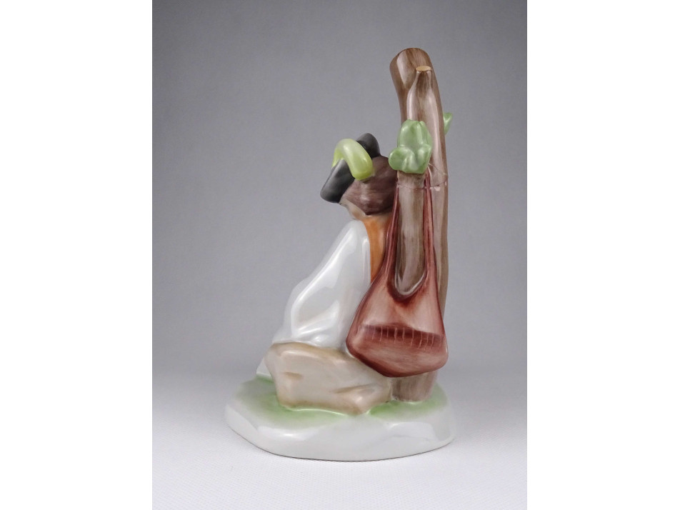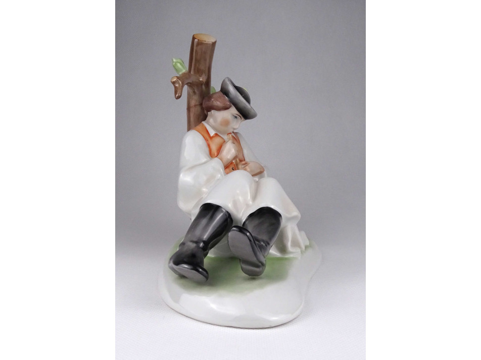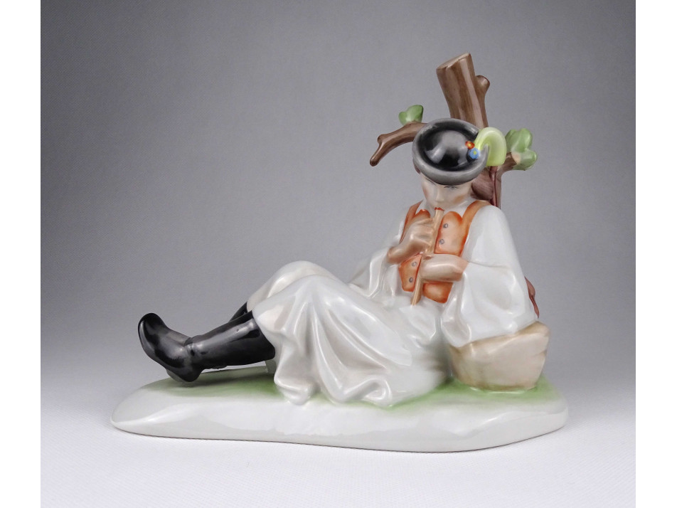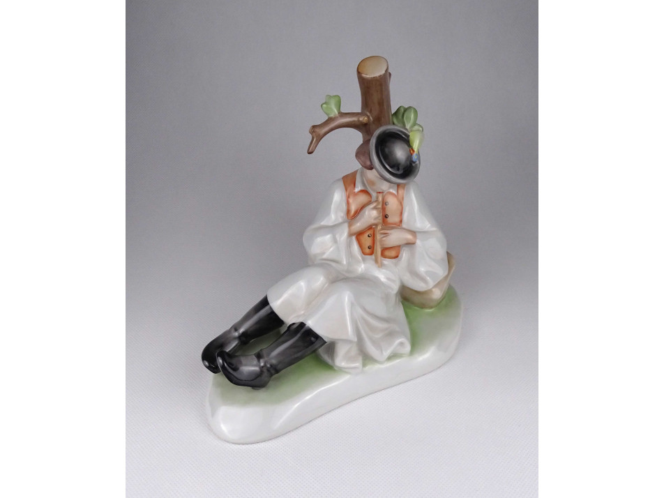 Szép állapotú, kézi festéssel díszített Zsolnay porcelán figura, furulyázó legény tollas kalapban. A fatörzs, aminek a juhász a hátát veti, törött, ragasztott. Szemből nézve egyáltalán nem látszik.