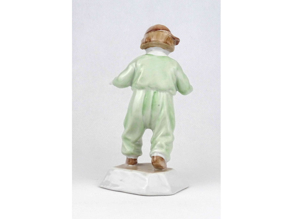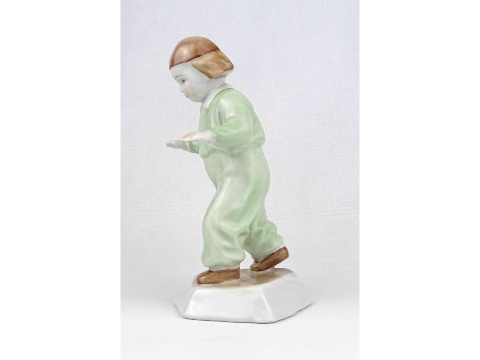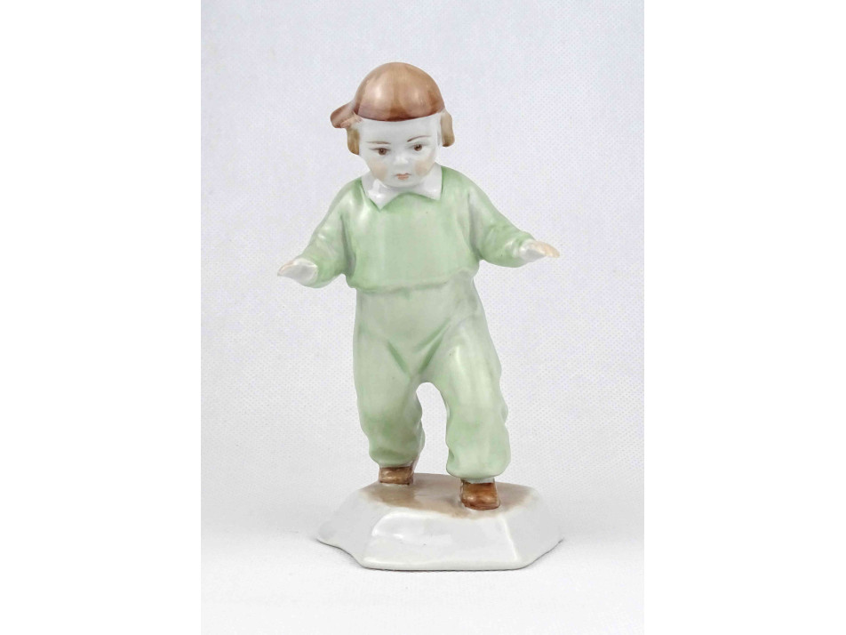 Régi, hibátlan állapotú, jelzetlen Zsolnay figurális porcelán szobor, járni tanuló sapkás kisfiú.