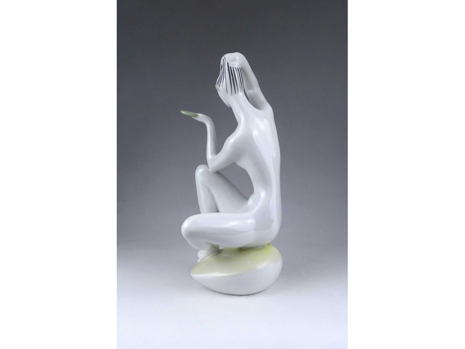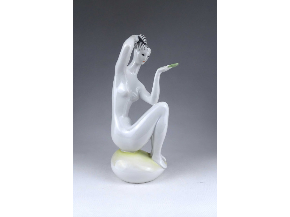 Régi, hibátlan állapotú, Török János tervei alapján készült, egész alakos, fésülködő női akt szobor, Zsolnay porcelán figura.