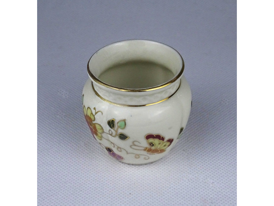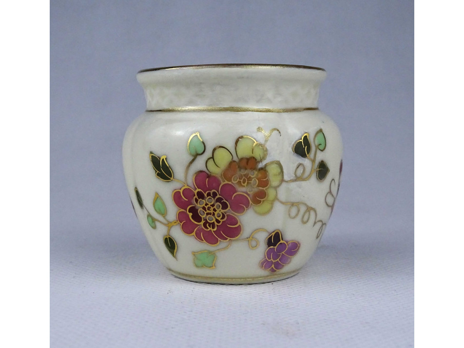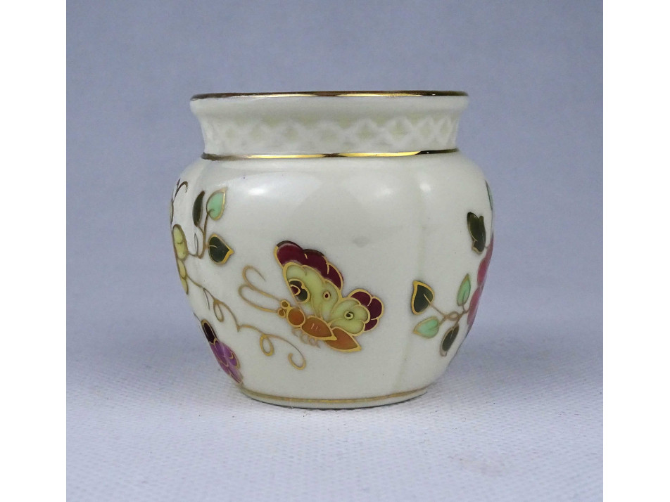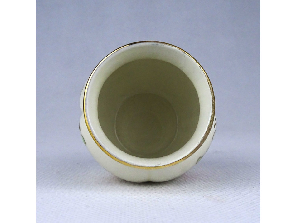Régi szép állapotú, jelzett, vajszínű, aranyozással gazdagon díszített, pillangó mintás, gerezdes porcelán kisváza, kis kaspó. Oldalán egy helyen restaurátor által szakszerűen javított.