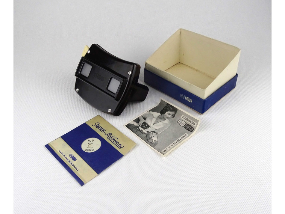 Meoskop Meopta bakelitházas, 3 dimenziós képnézegető eredeti szép állapotban. A dobozban egy Róma látványosságat tartalmazó tárcsa található.