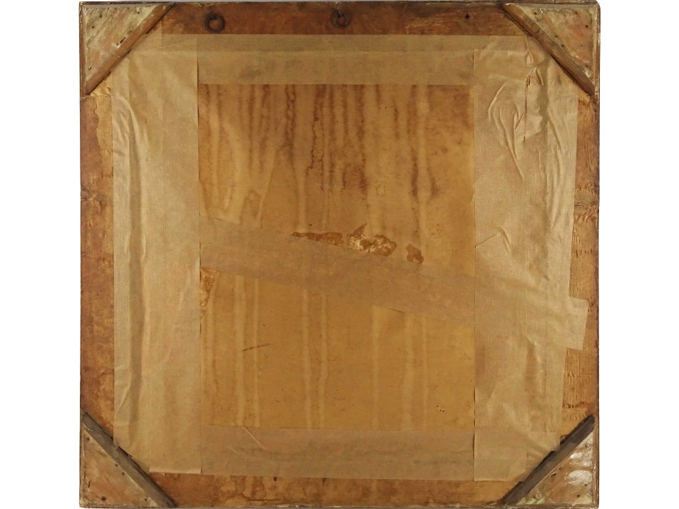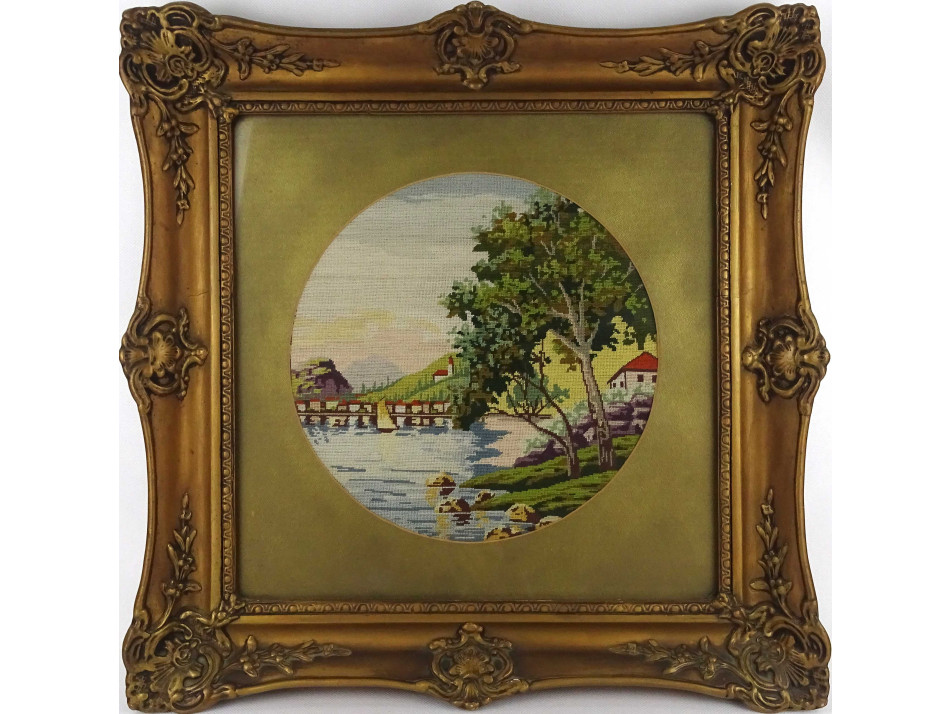 Szép állapotú, régi arany színű blondel keretben üveglap mögött, arany színű, kör alakú paszpartuban lévő finom tűgobelin, kézimunka. Akasztási lehetőséggel rendelkezik.