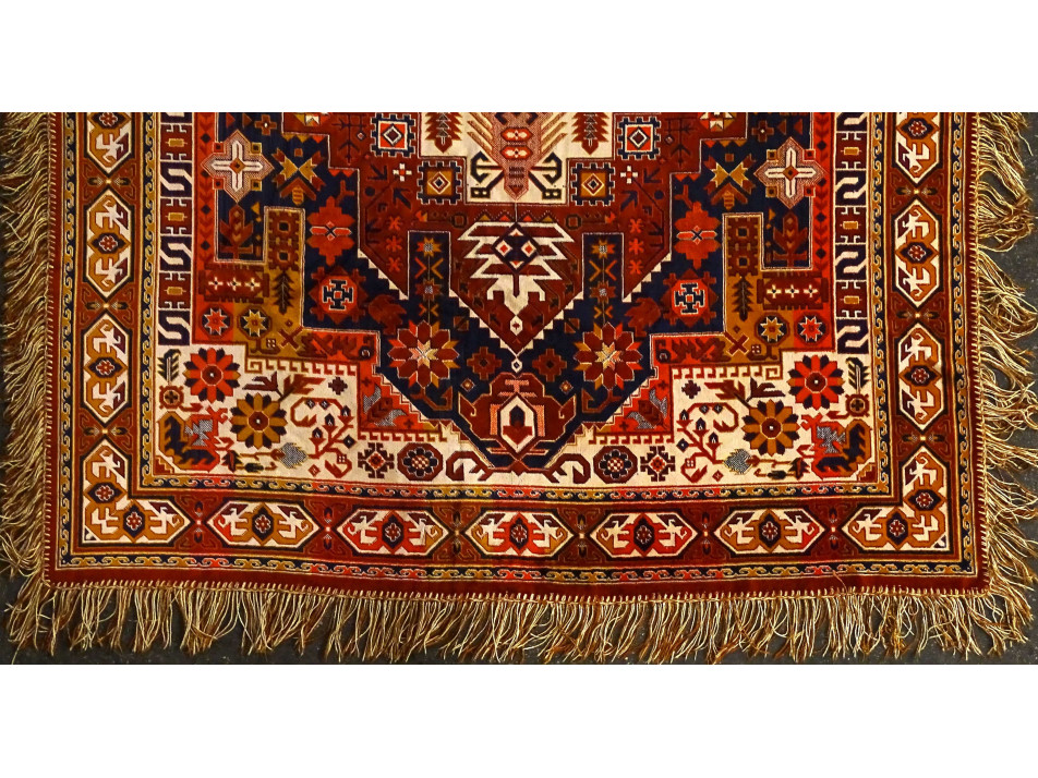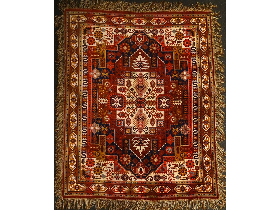 Gyönyörű, szép állapotú selyem mokett, goblein-szerű, szövésű vékony anyag. Finom anyagú ágytakaró, rendkívül részletes, részletgazdag mintával, élénk színekkel szinte használatlan állapotban. Négy oldalán körben rojtozott. Az egyik rövidebb oldalán a rojtok tövében varrással javított.