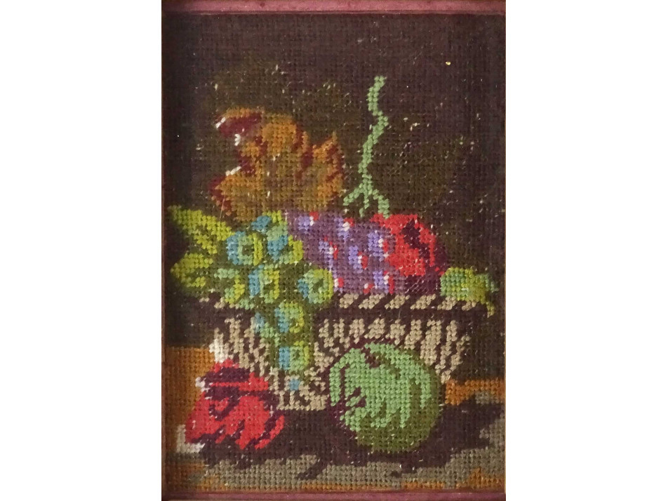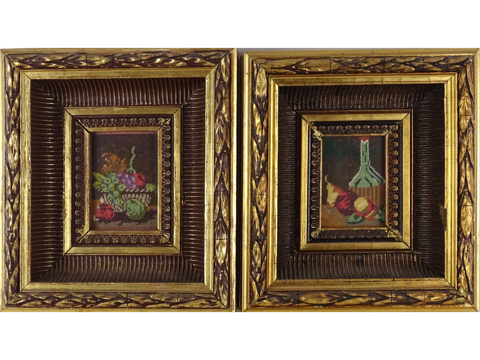 Régi csendéletet ábrázoló tűgobelin pár, szép állapotú, széles, aranyozott díszes keretben, üveglap mögött. Akasztási lehetőséggel rendelkeznek.