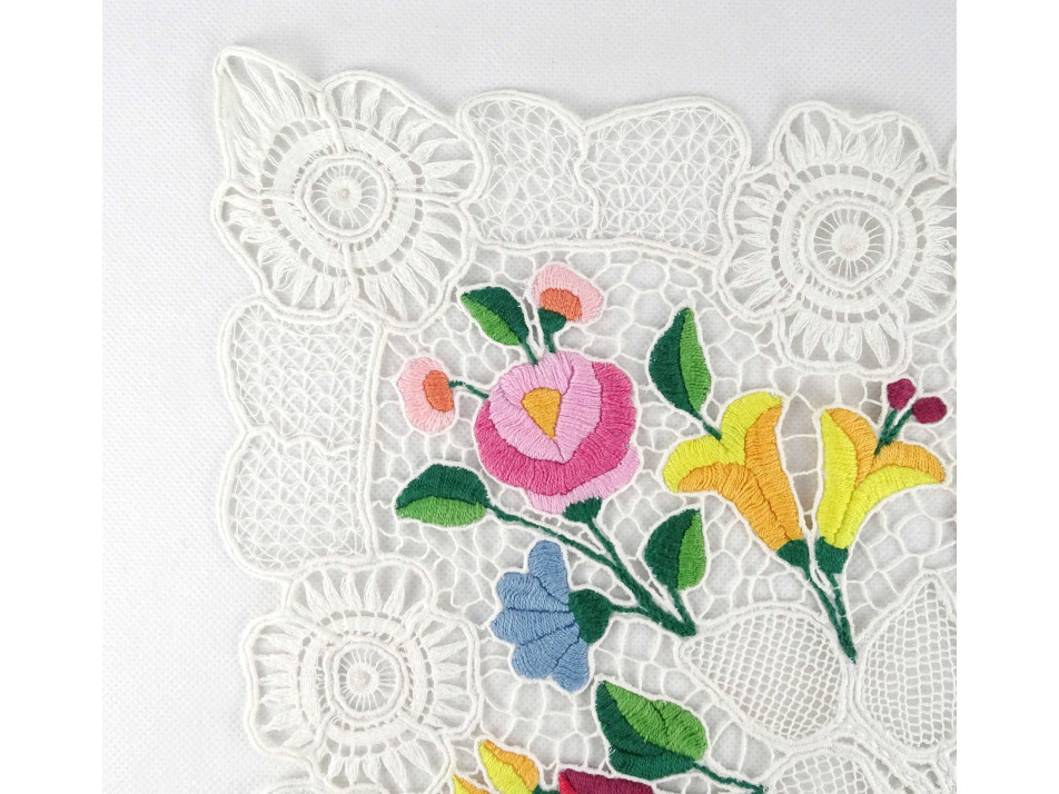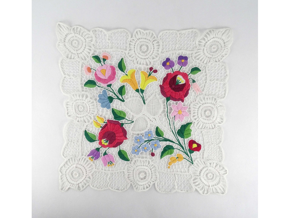 Régi gazdagon hímzett kalocsai mintás csipke terítő 35 x 35 cm