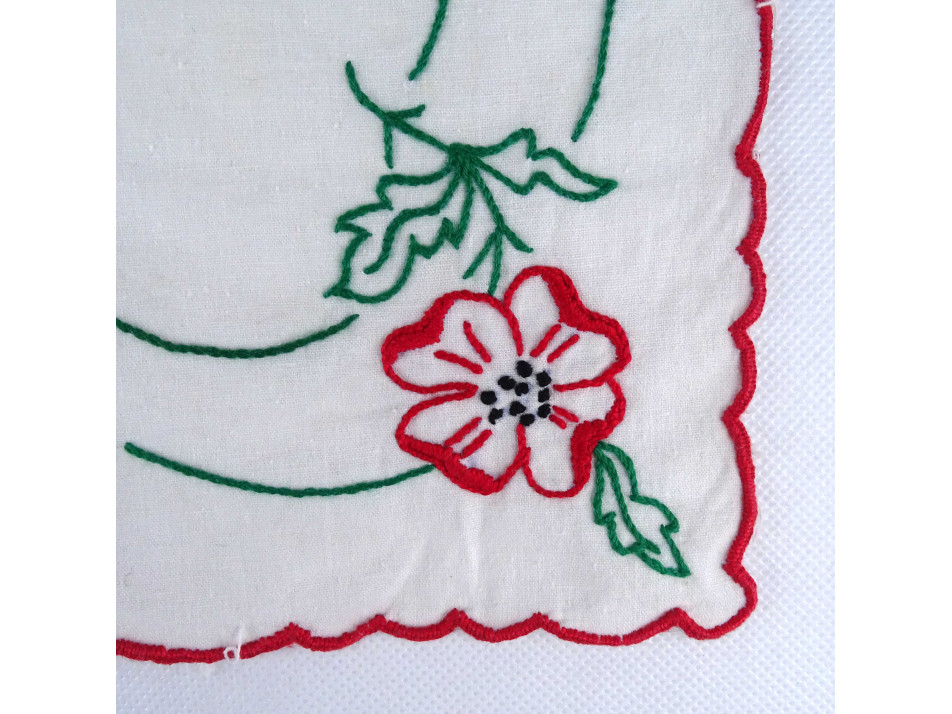 Lenvászonra hímzett, piros zöld pipacs mintás terítő, kézimunka, asztalterítő pár.