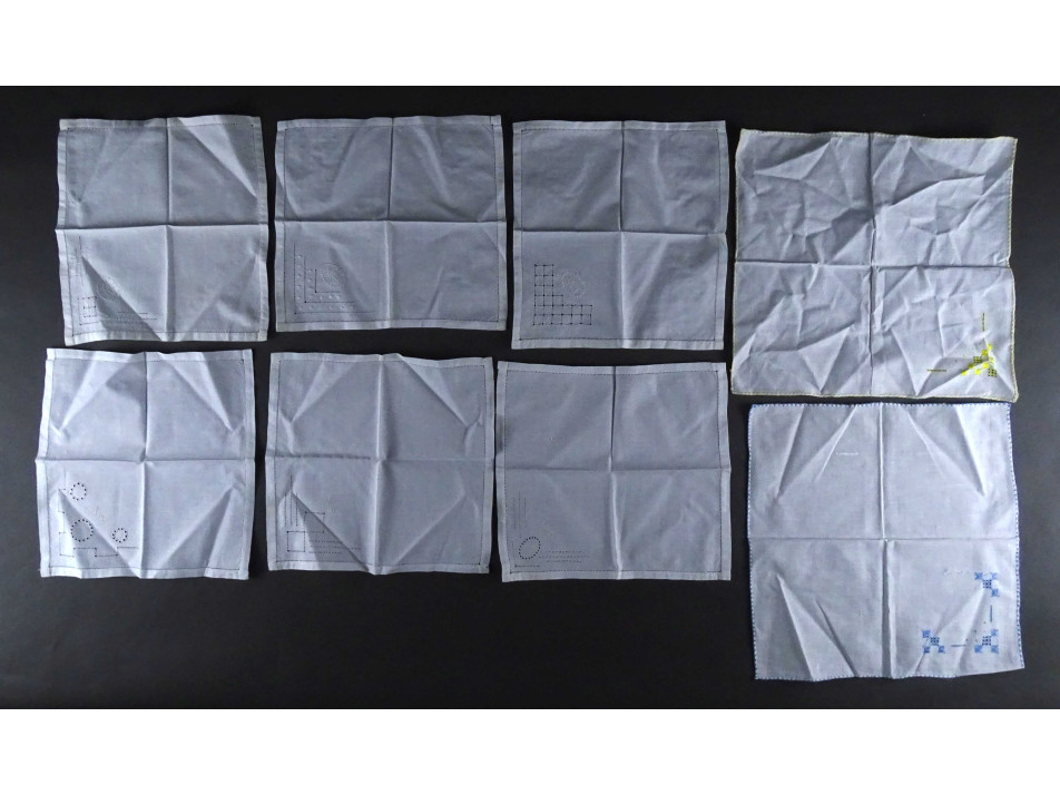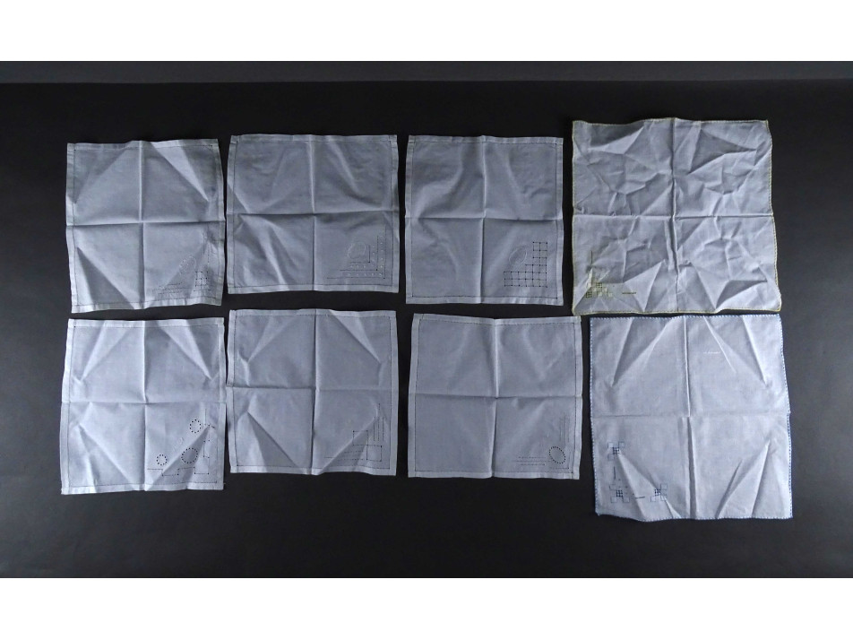 Régi, gyönyörű, hajtogatott, lenvászon anyagú, hímzett zsebkendő csomag, 8 darab, melyből 6 darabra a RÓZSI feliratot hímezték.