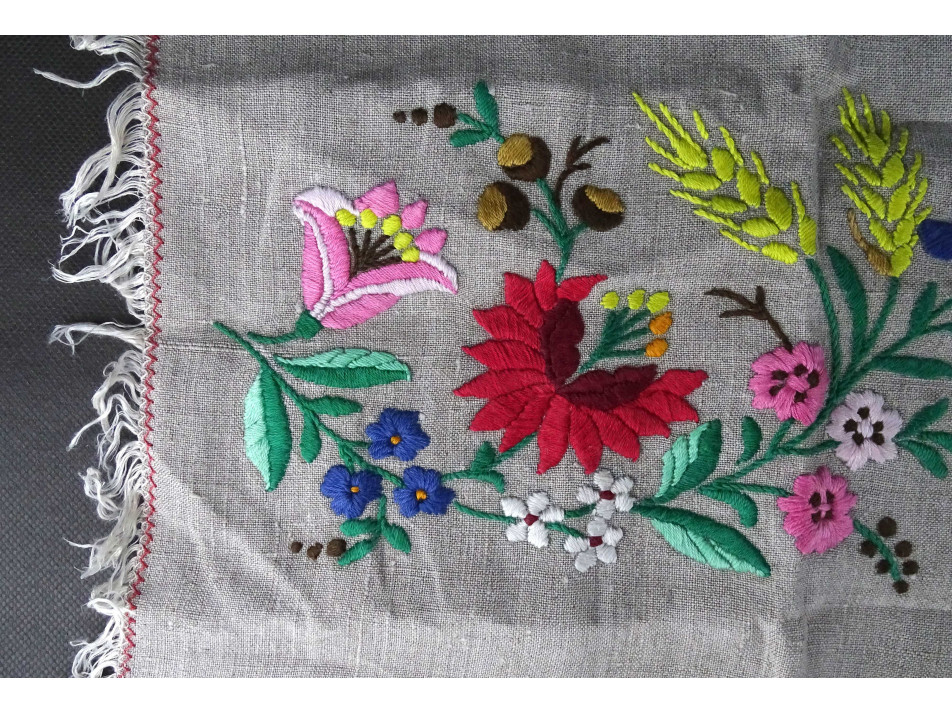 Régi, hibátlan állapotú, aprólékosan hímzett kalocsai mintás szürke vászon terítő.