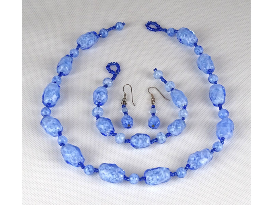 Hibátlan állapotú gyönyörű kék-fehér fújt üveggel és apró gyöngyökkel díszített ékszer szett.