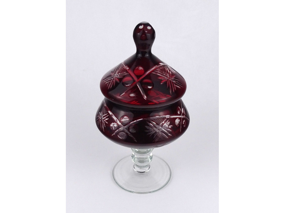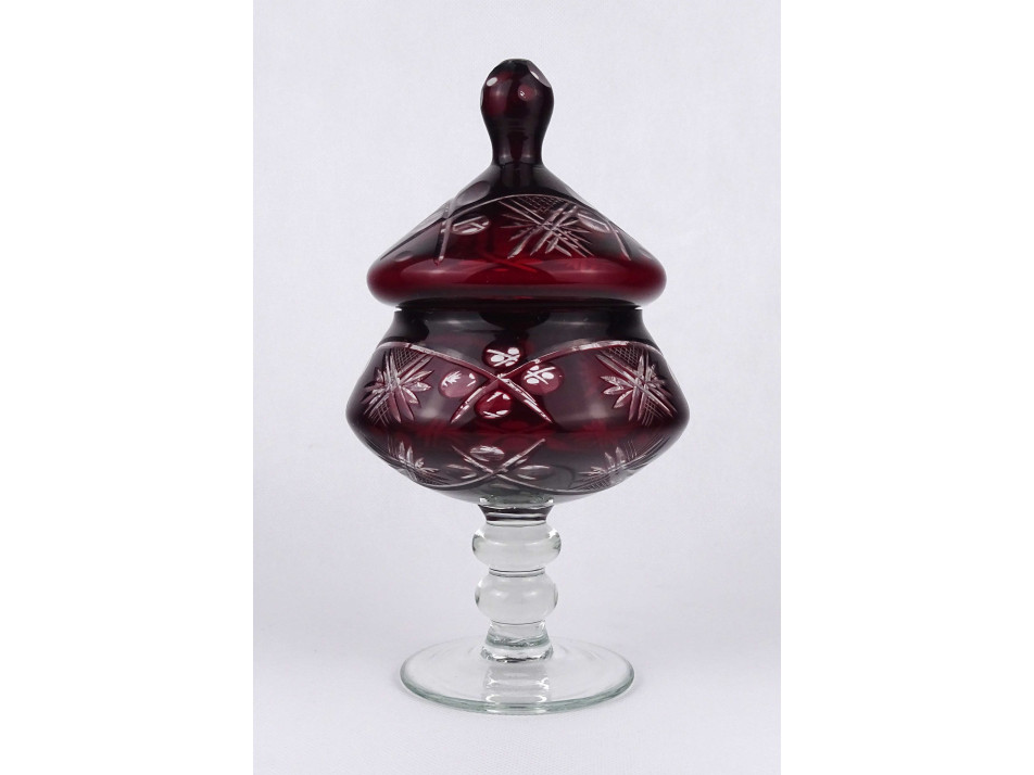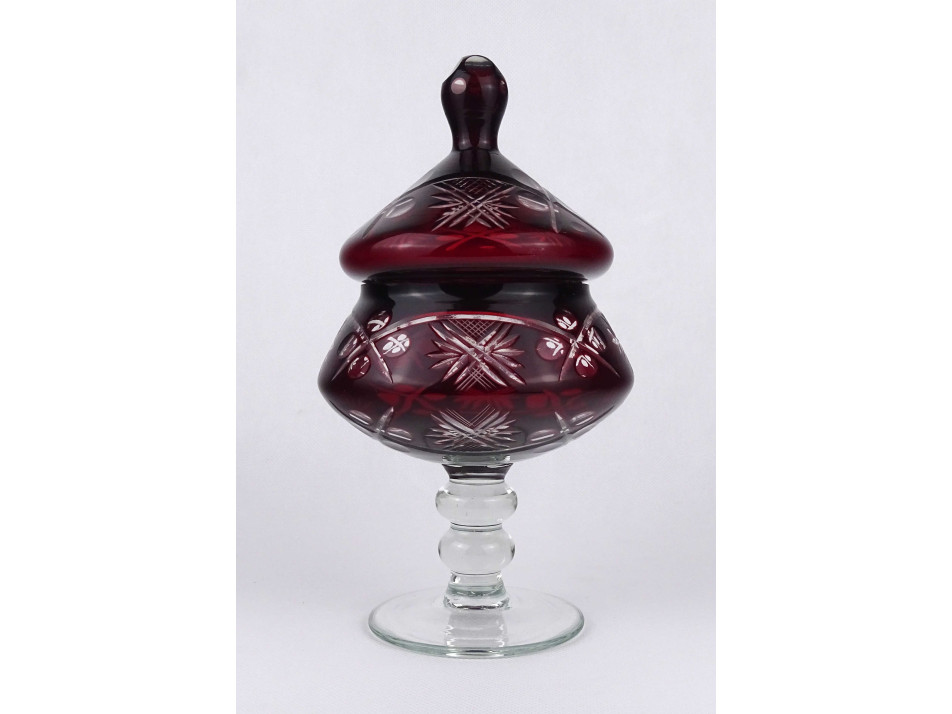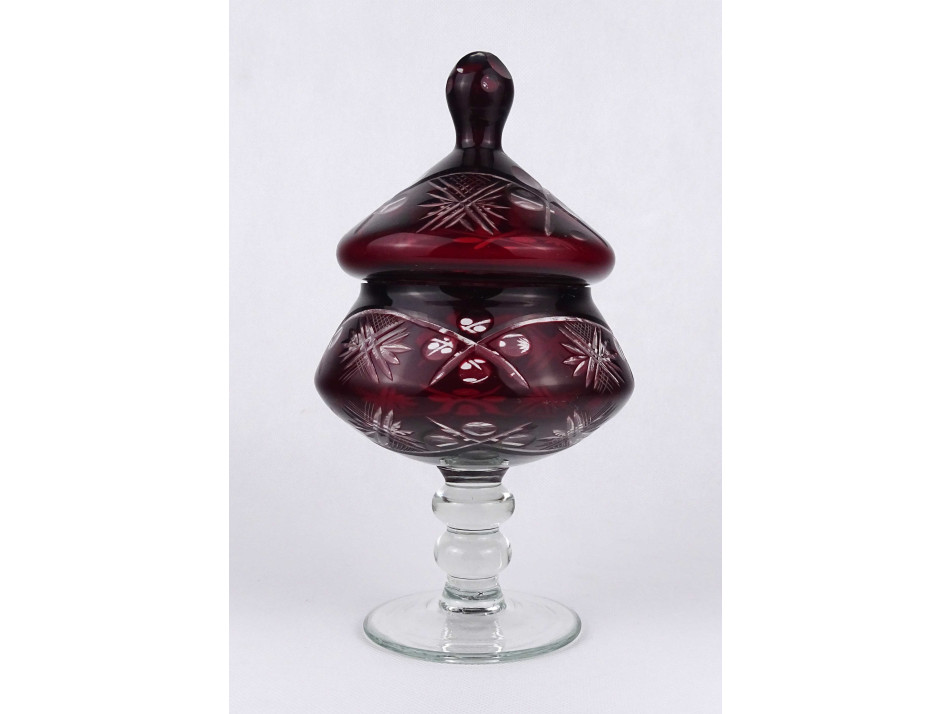 Nagyméretű, hibátlan állapotú, gazdagon díszített, bordó színű, fedeles, talpas üveg bonbonier.