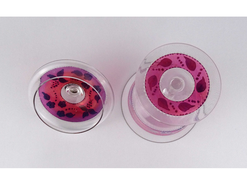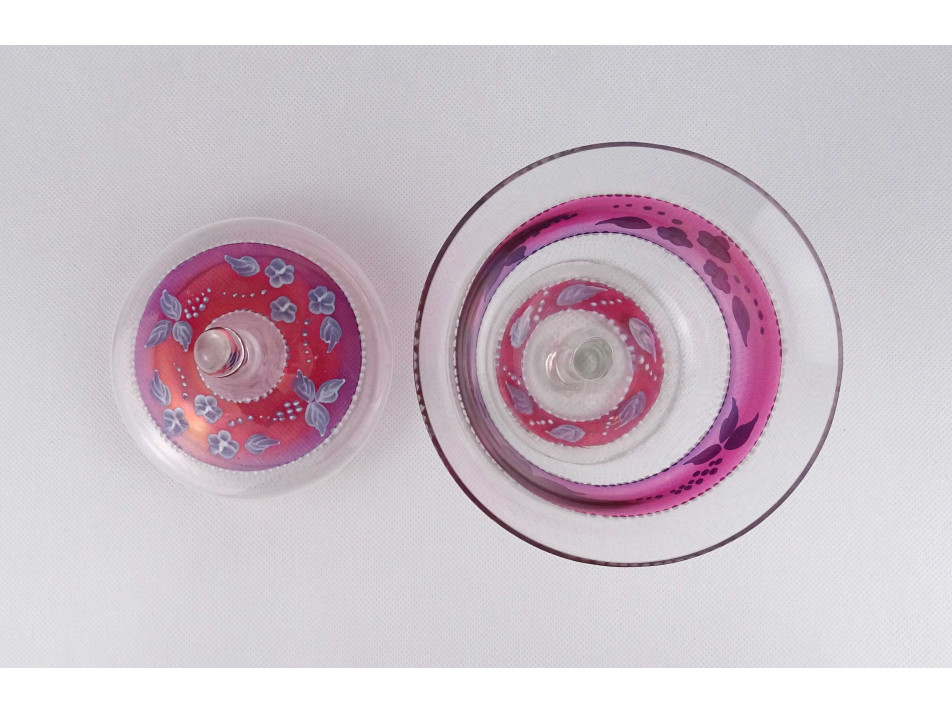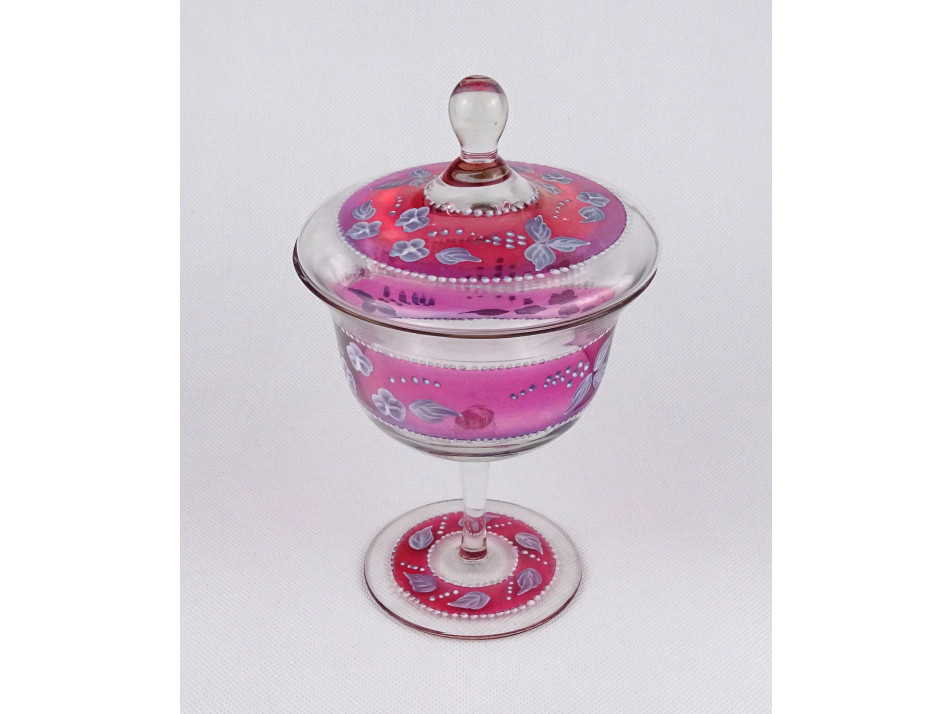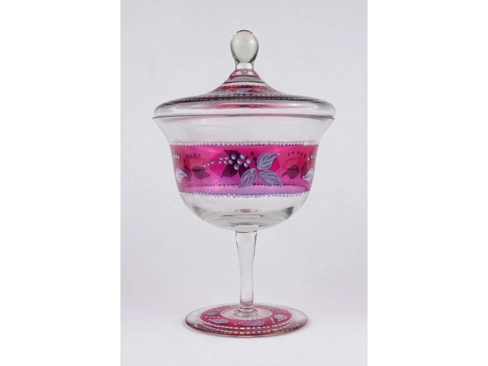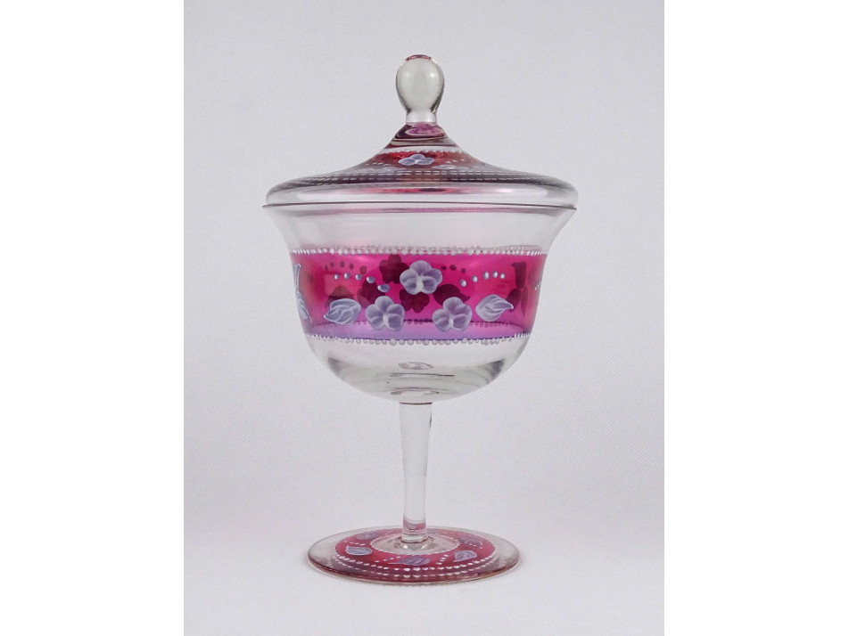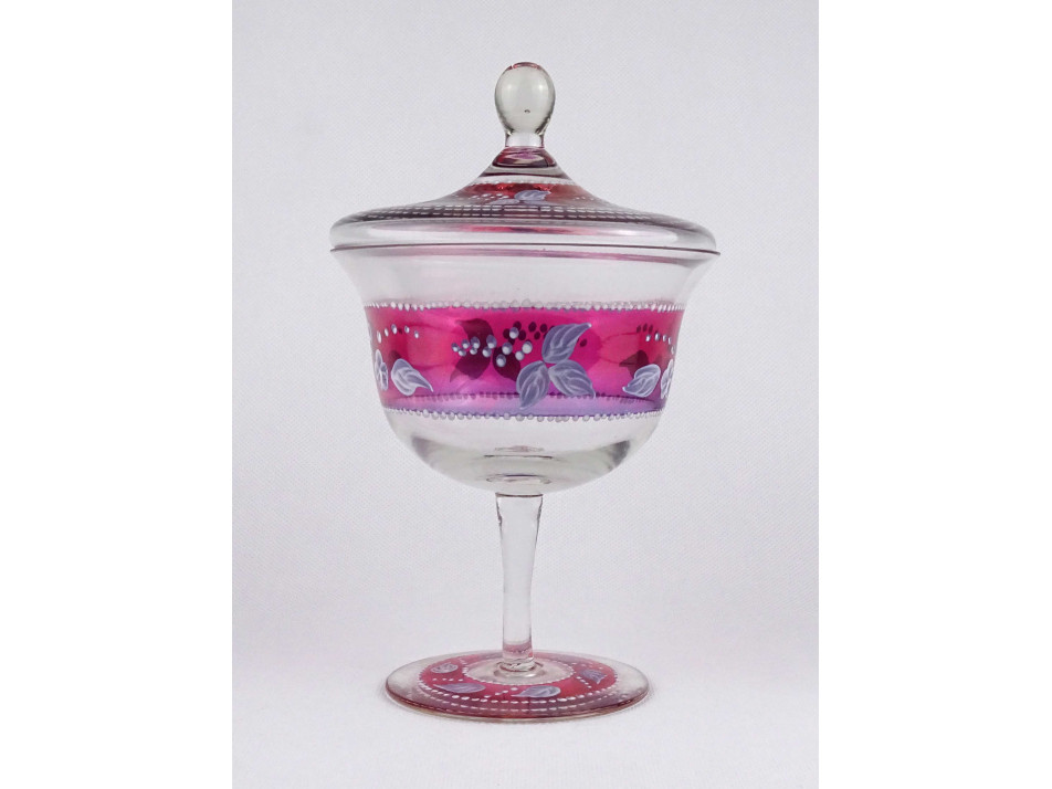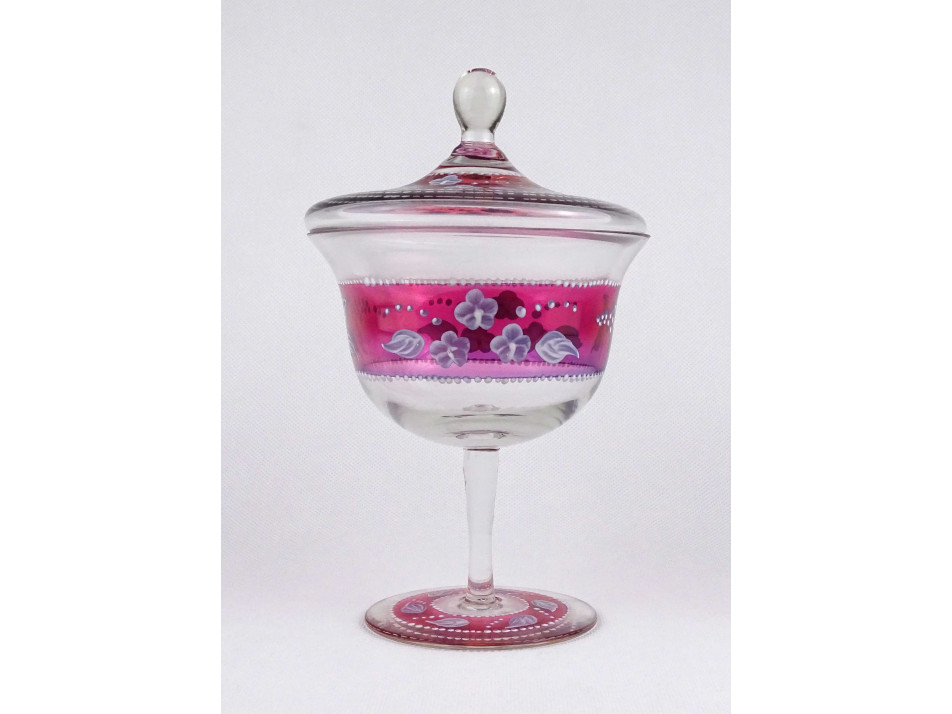 Nagyméretű, hibátlan állapotú, festett virágmintával gazdagon díszített, bordó színű, fedeles, talpas üveg bonbonier.