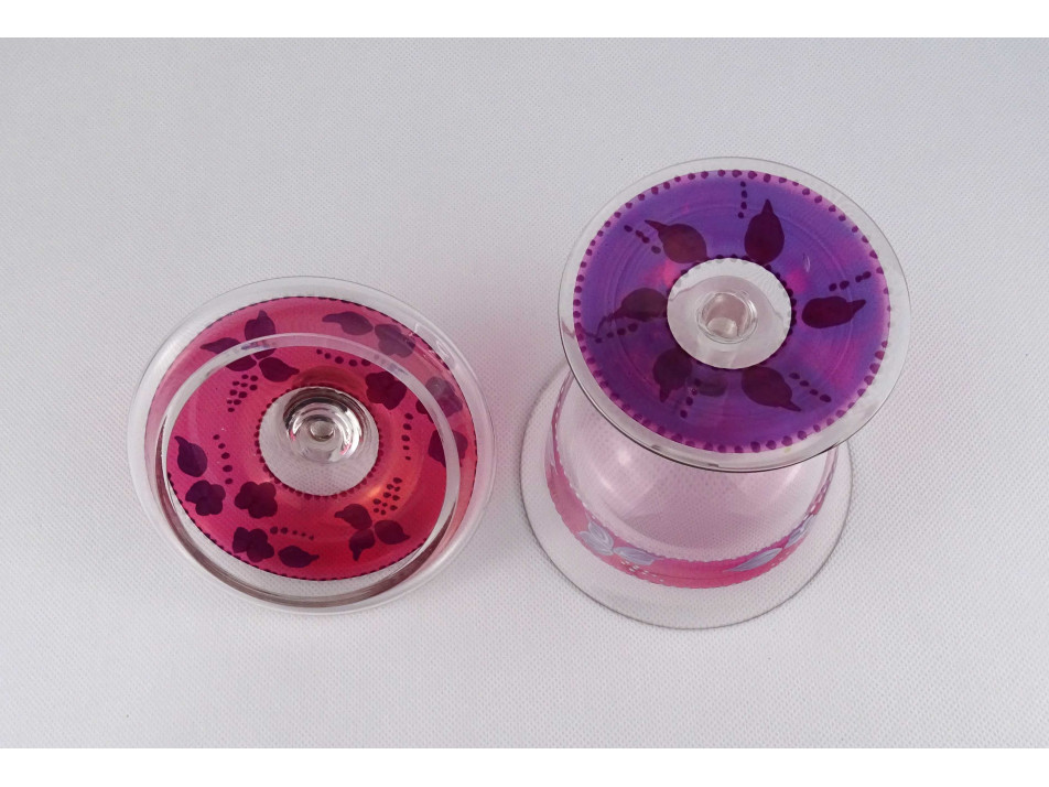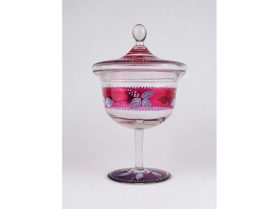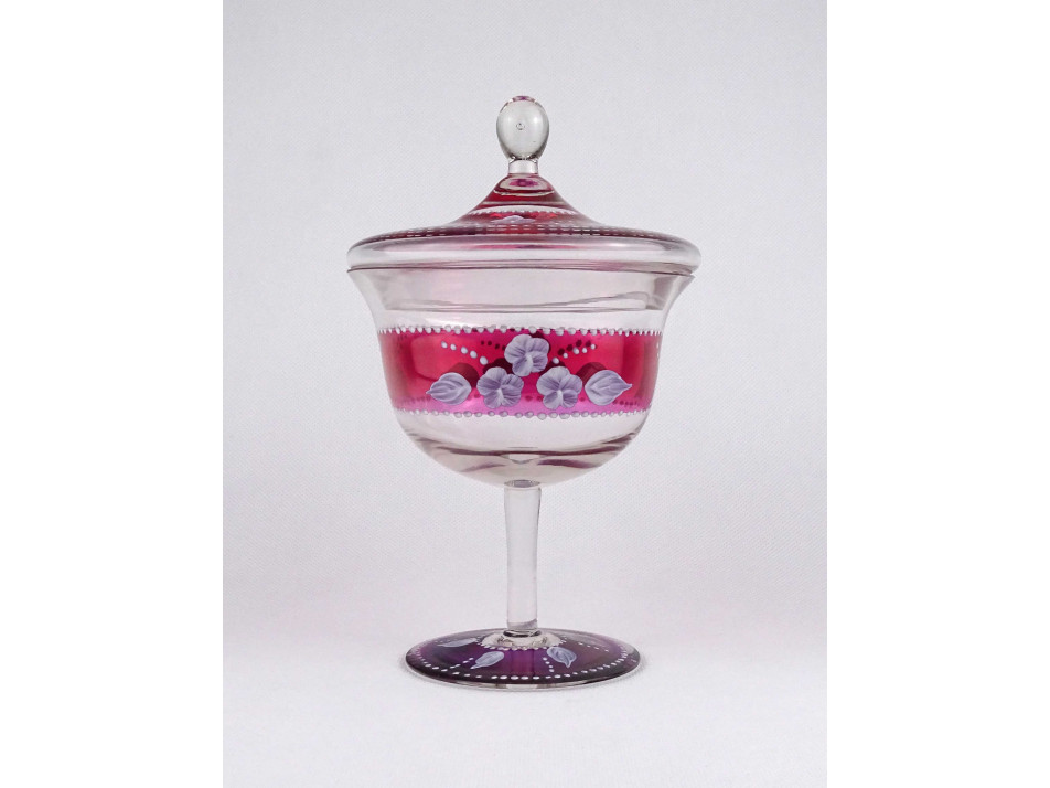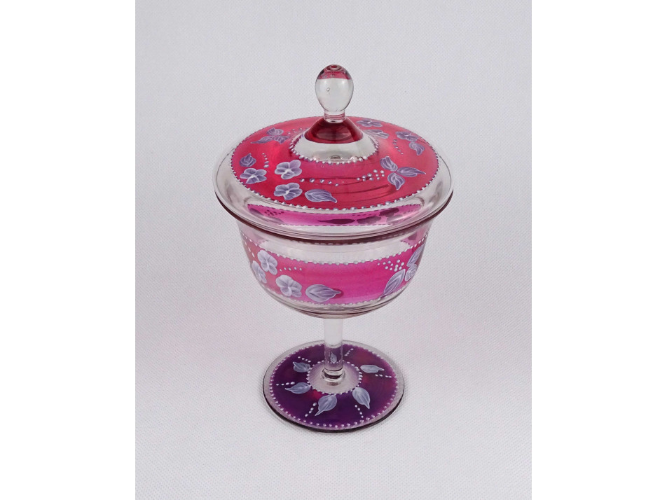 Nagyméretű, hibátlan állapotú, festett virágmintával gazdagon díszített, bordó színű, fedeles, talpas üveg bonbonier.