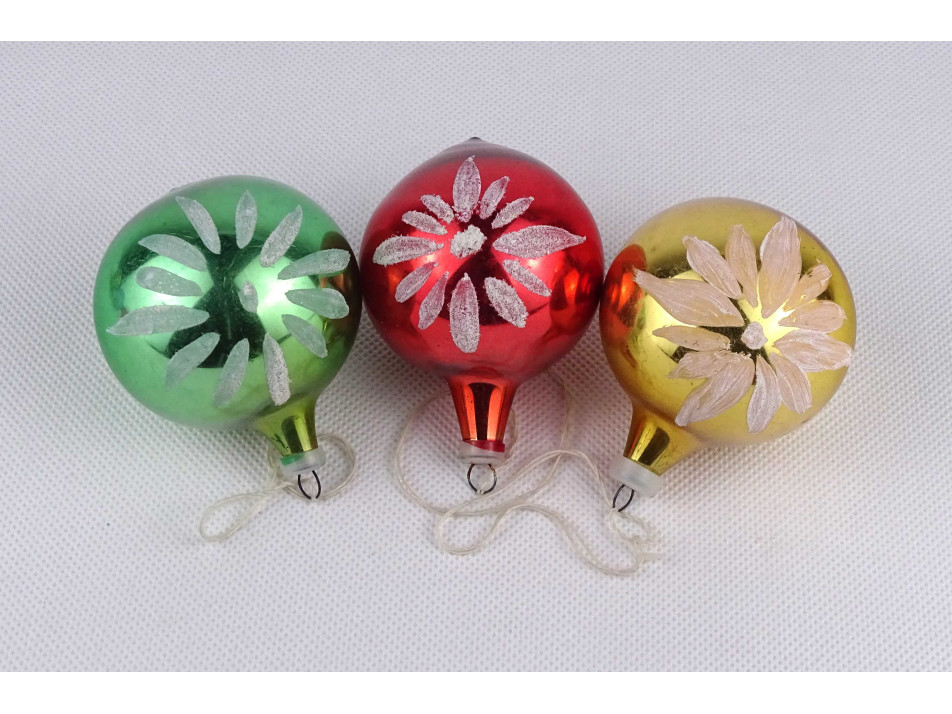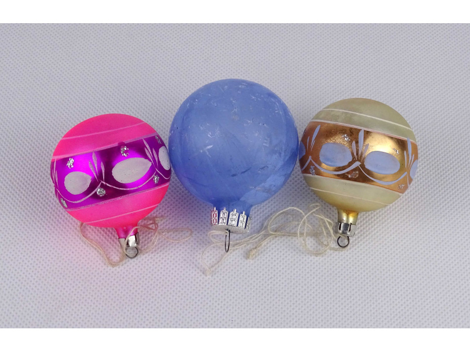 Régi, szép állapotú üveg karácsonyfadíszek, függők, aranyporral szórt díszítéssel. Színek: piros, kék, arany, rózsaszín, zöld. 6 darab egyben.