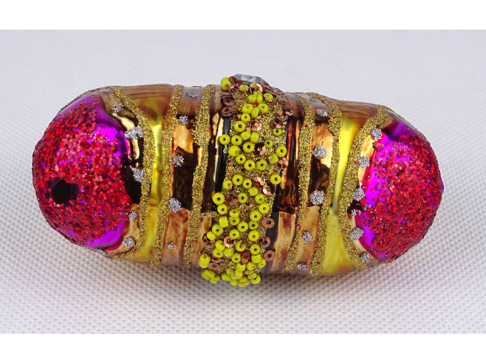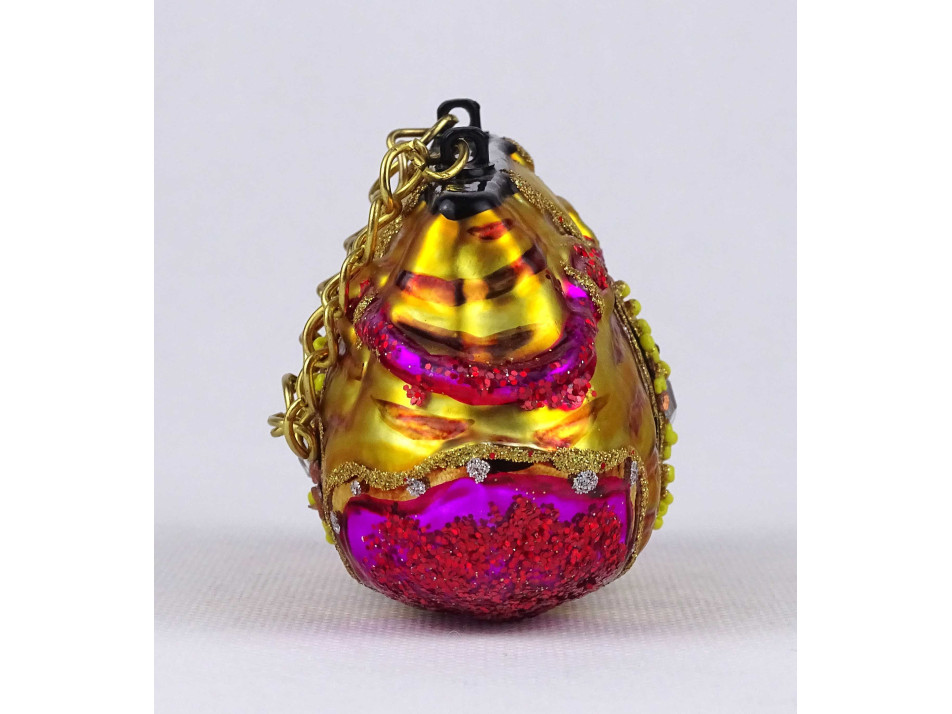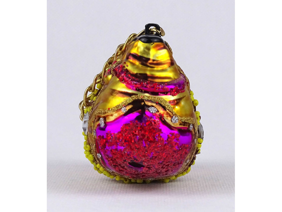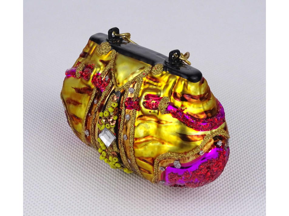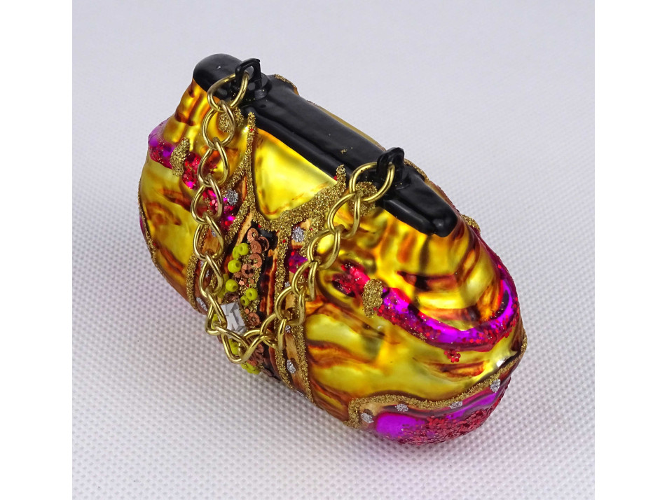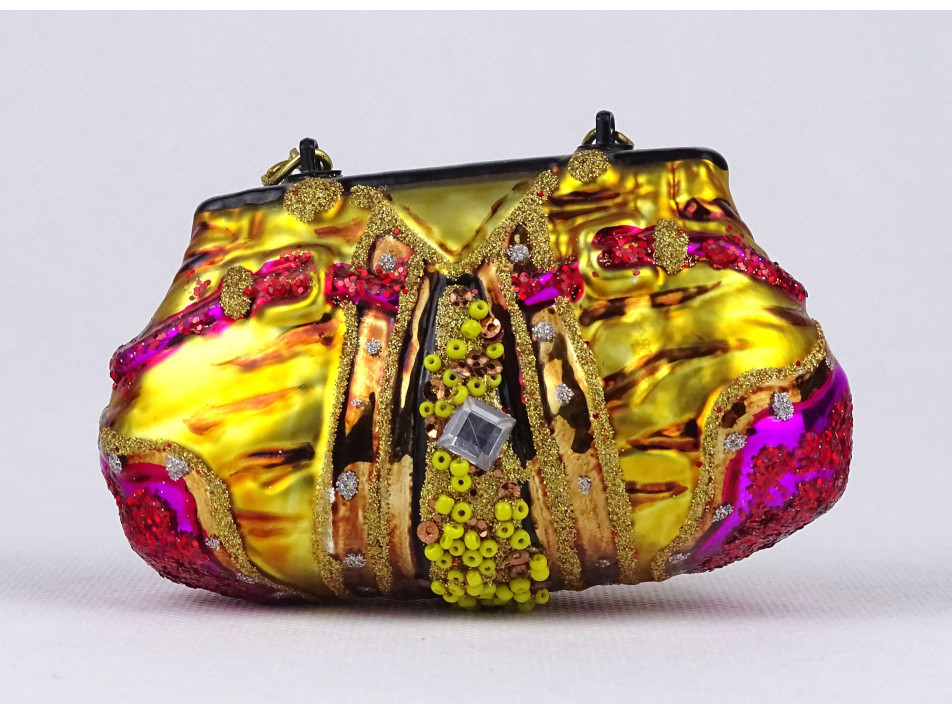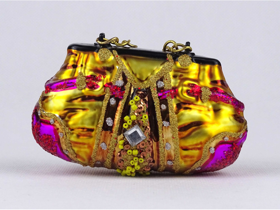 Modern, női táska alakú, gyöngyökkel díszített, színes festett üveg karácsonyfadísz.